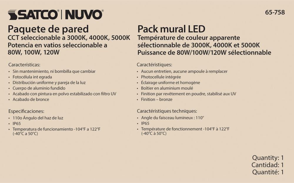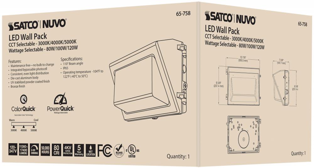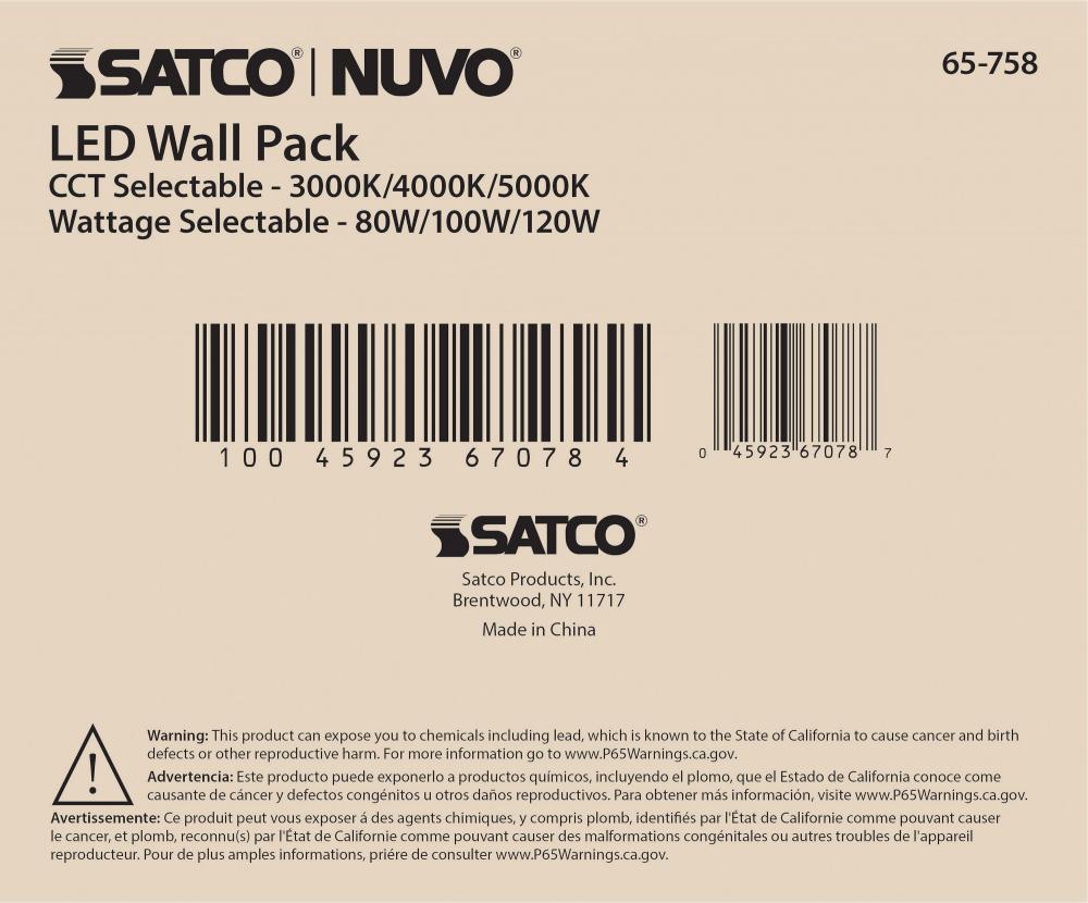 Introducing 65-758, SATCO NUVO's new CCT and Wattage selectable wall pack with integrated bypassable photocell. This cULus certified wall pack is offered in a traditional style with 80W/100W/120W wattage configurations, CCT selectable temperatures of 3