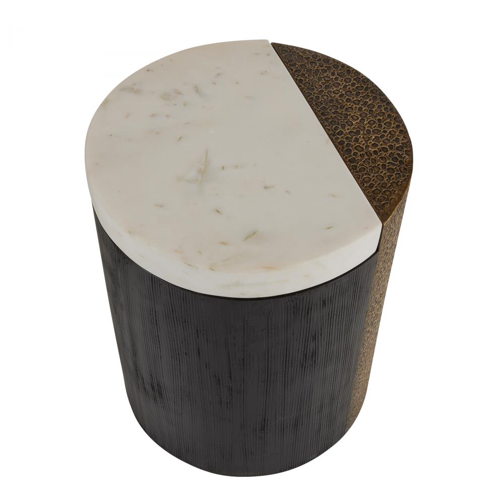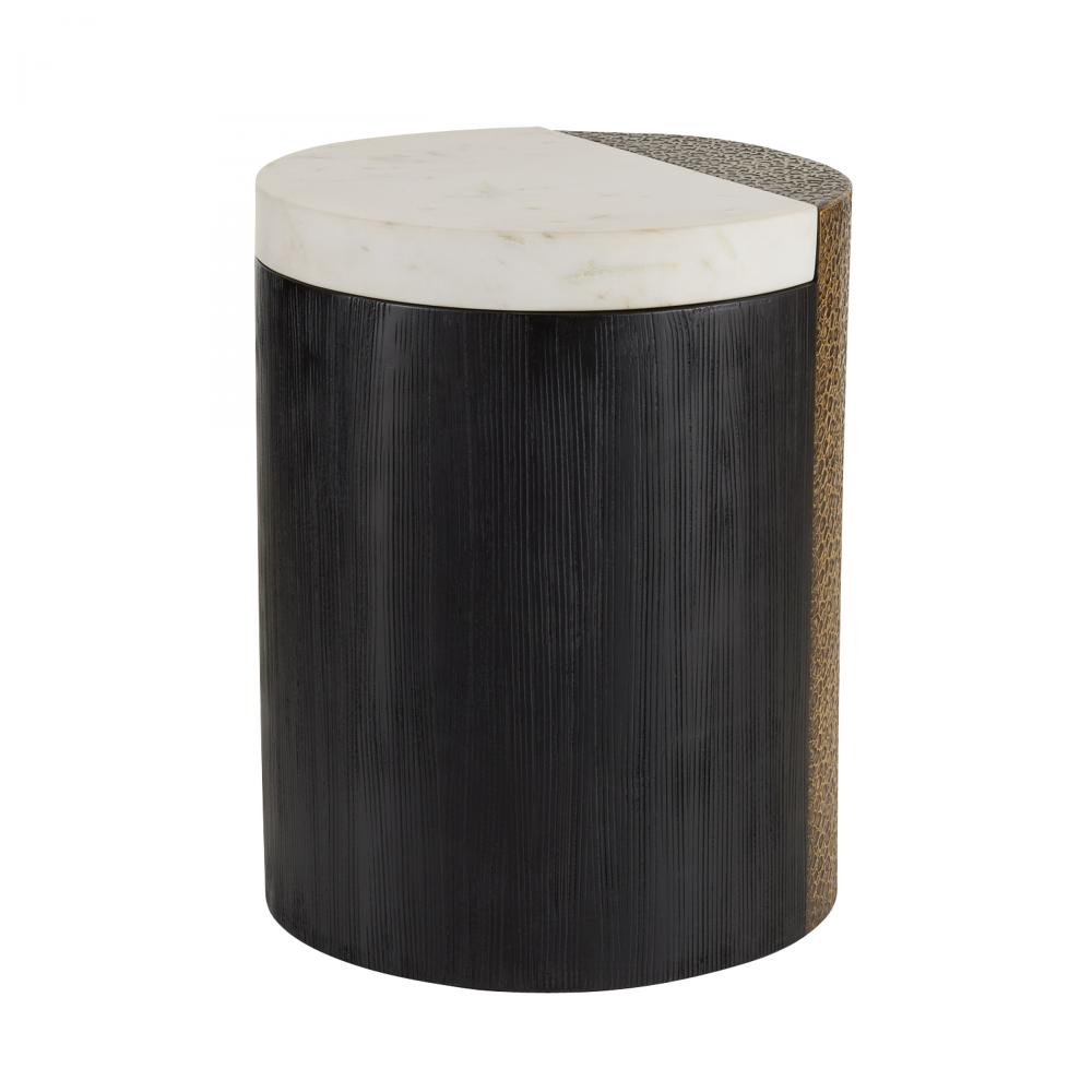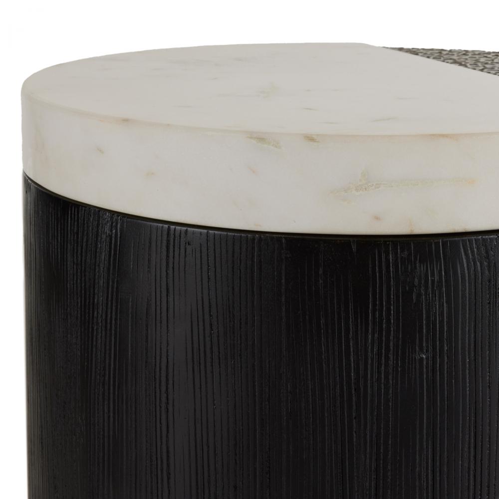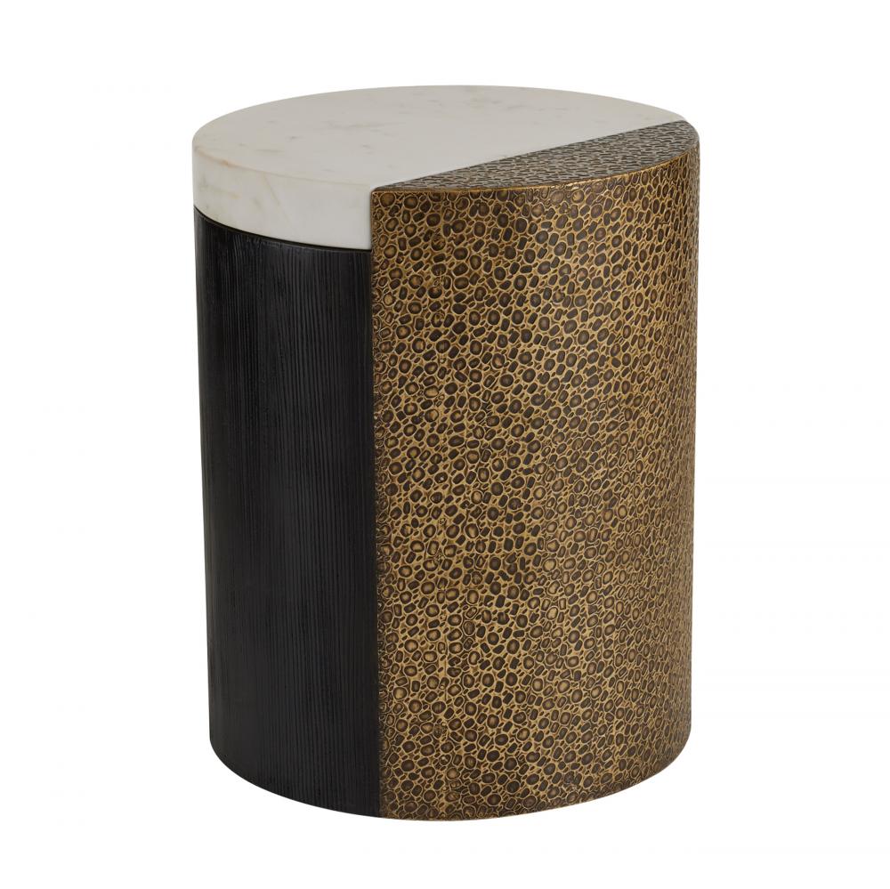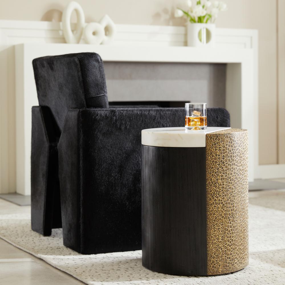 Mixing white marble, antique brass clad and ebony mango wood to eye-catching effect, we designed a simple column table with an artisanal edge. Scored details and sliced planes further highlight this piece’s simplicity and luxury. Finish will vary.