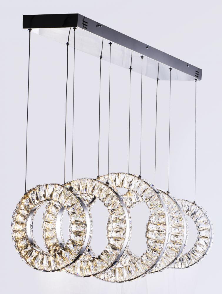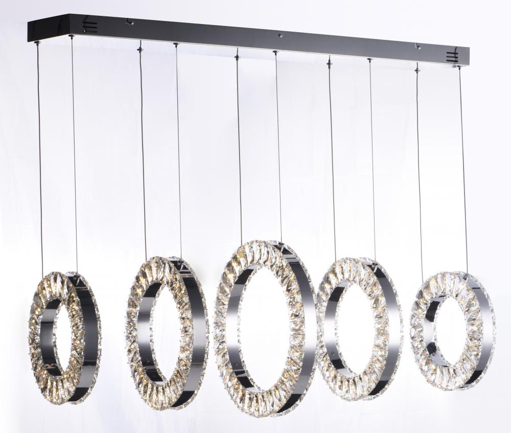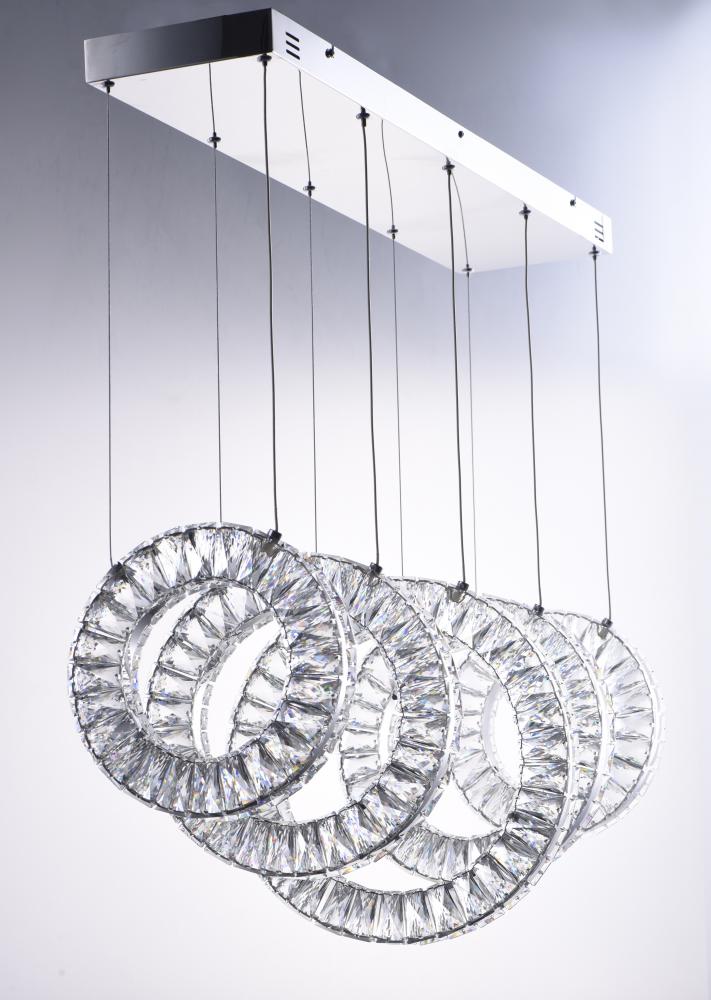Rings of Beveled Crystals are mounted into a Polished Chrome band and suspended from cable as if they were floating in air. Multiple size rings mounted in descending order create a unique and brilliant light form which is sure to be the focal point of the