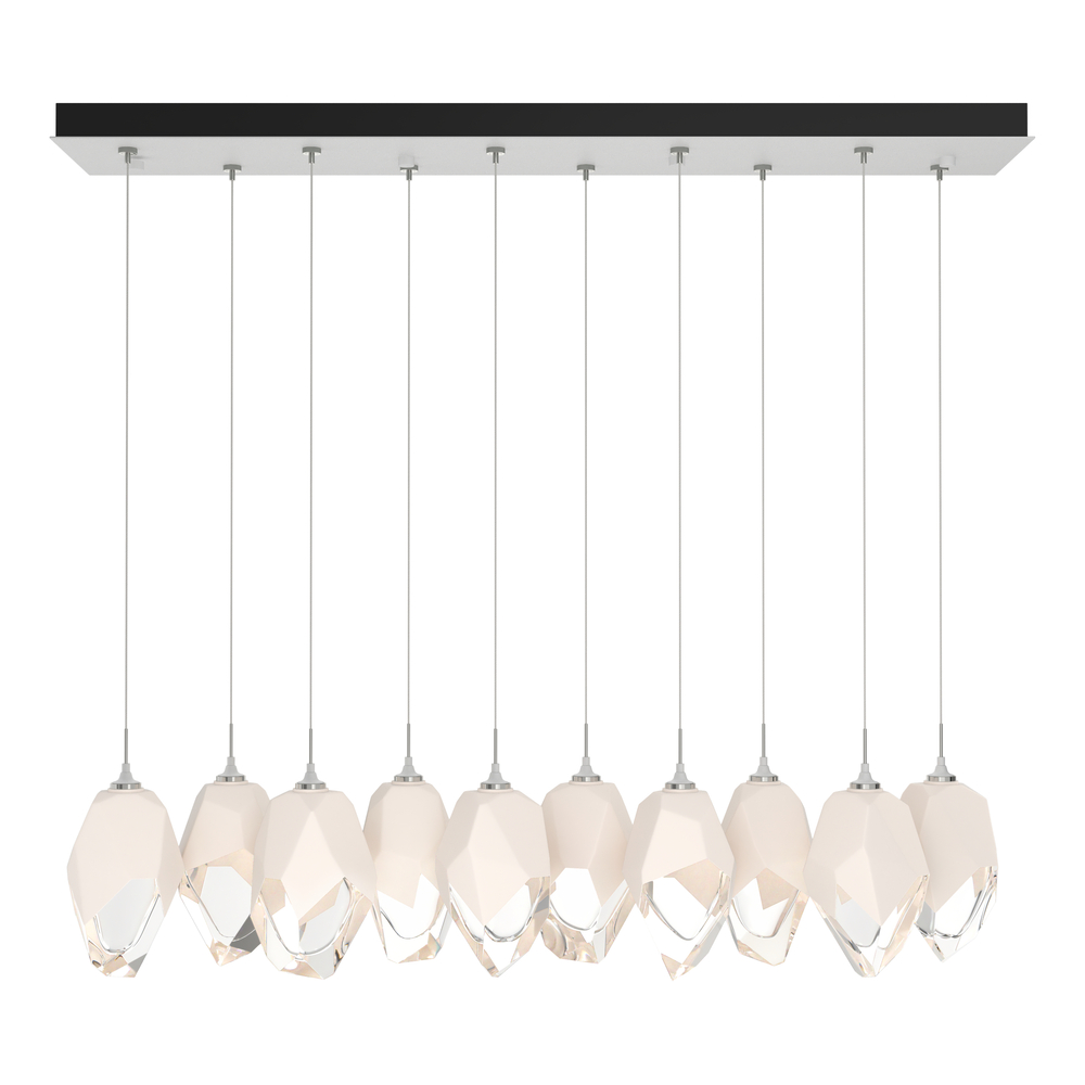 Ten Large Chrysalis pendants hung from a rectangular canopy. Each pendant may be individually adjusted for a custom look. Note, the upper canopy can will always be black while the canopy faceplate will match the selected finish.