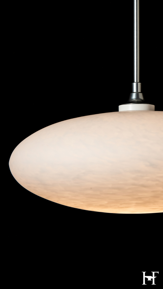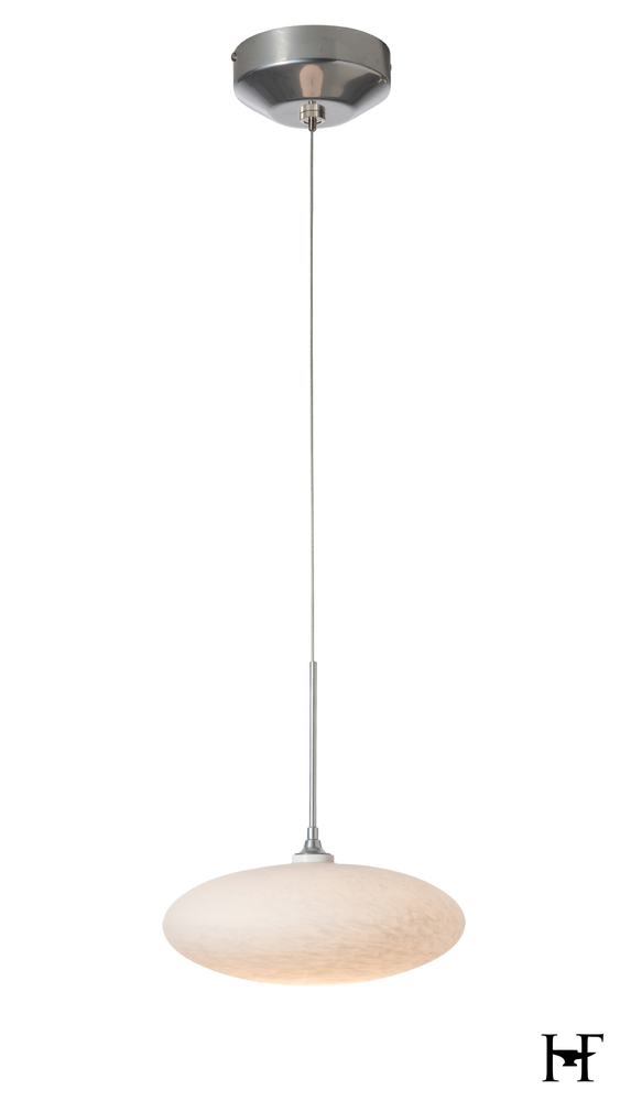 A large squoze sphere that looks to have been pressed on top and bottom to form its unique and delicate shape. Like the puff of a cloud (some also see a UFO) the Cloud is suspended on a low voltage cable. It's white tortoise shell-like glass glows from the light within.