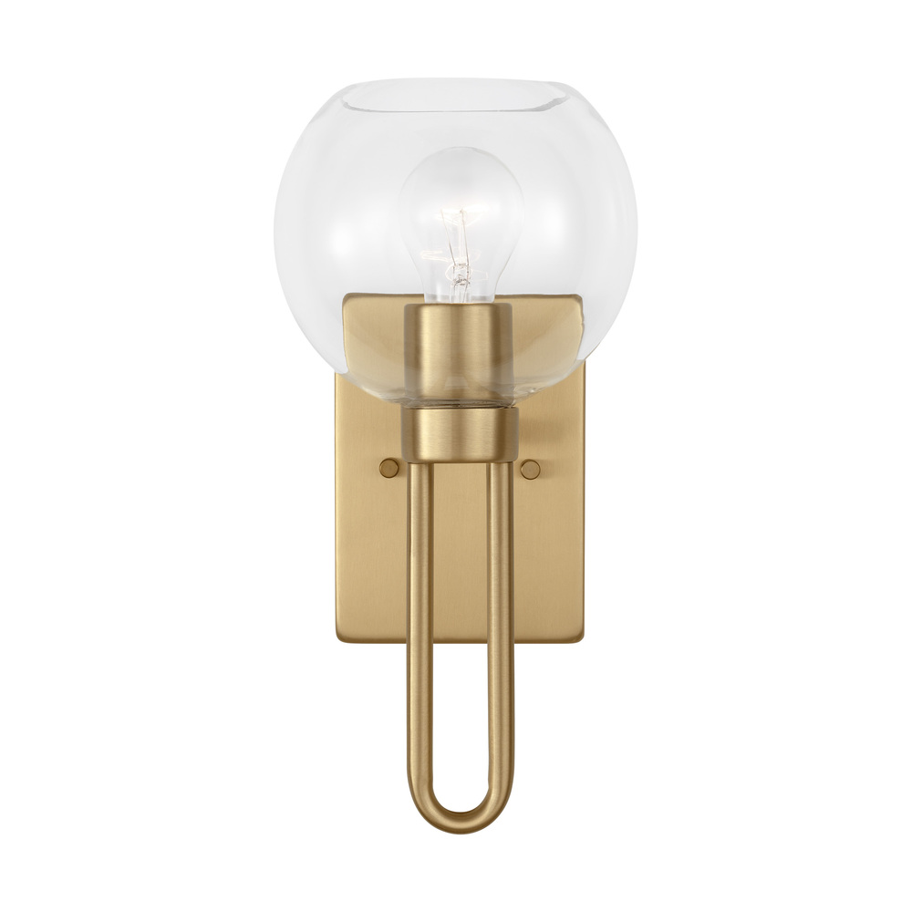 The Codyn one light wall sconce in Satin Brass is a contemporary take on a classic mid-century design. Clear glass shades with open-ended spheres accent the elongated keyhole strap detail, for a clean look. This minimalist collection relies on subtle details to create visual interest