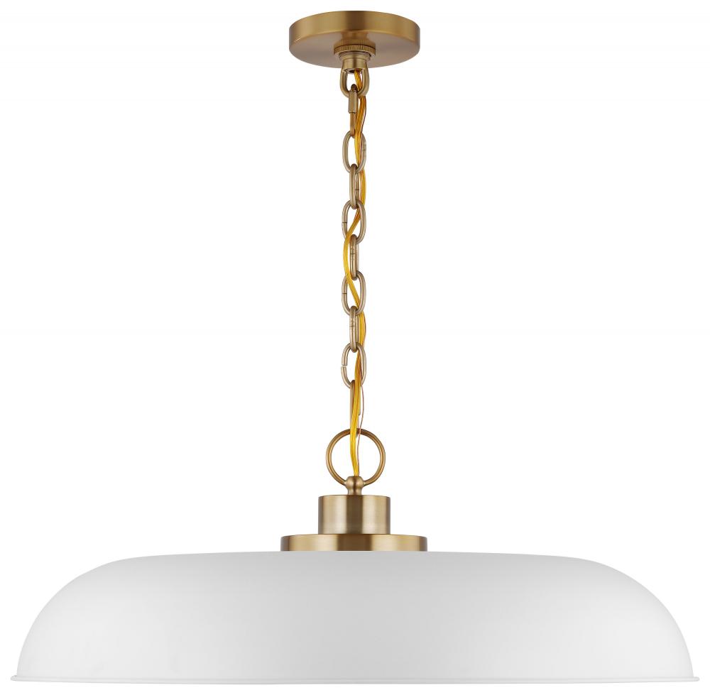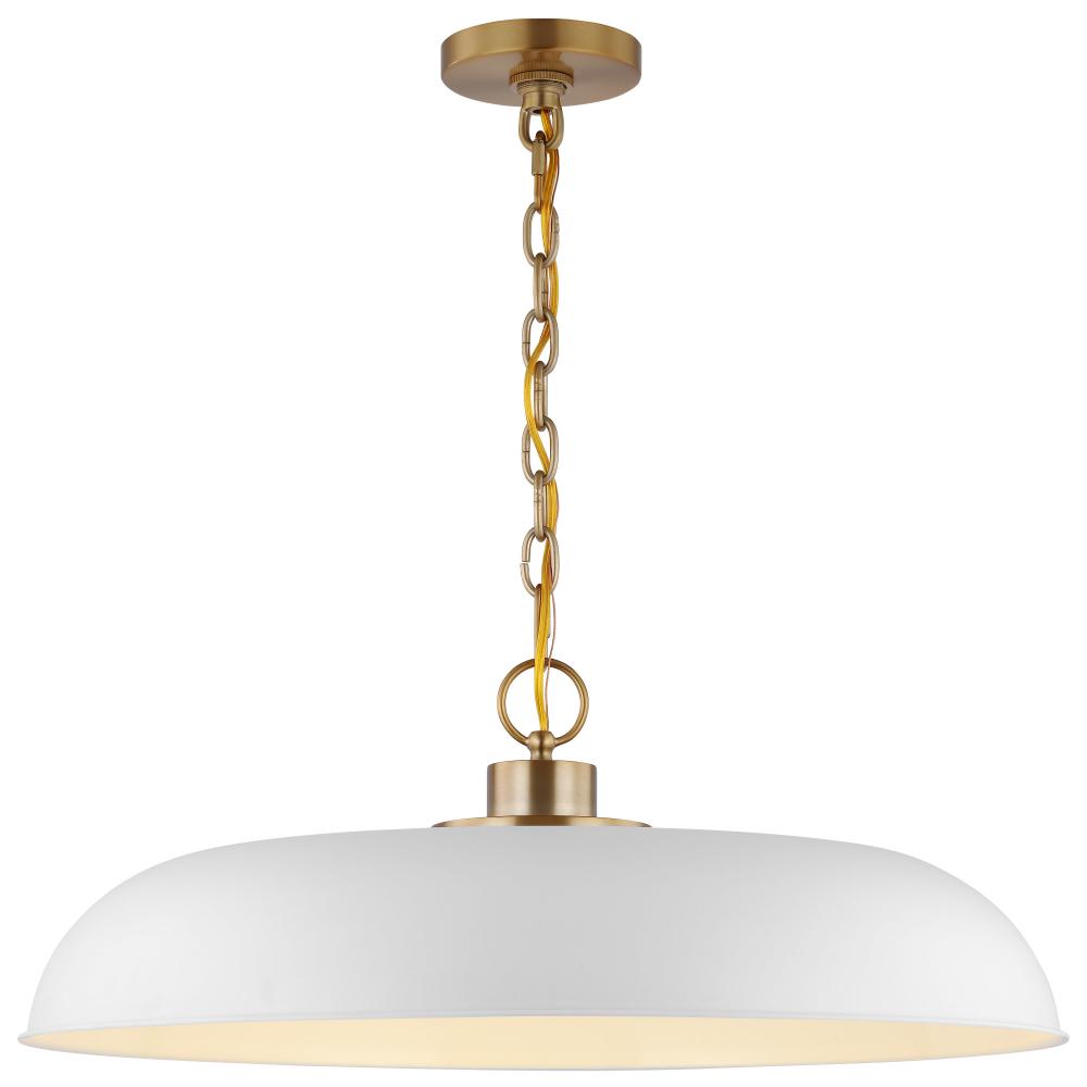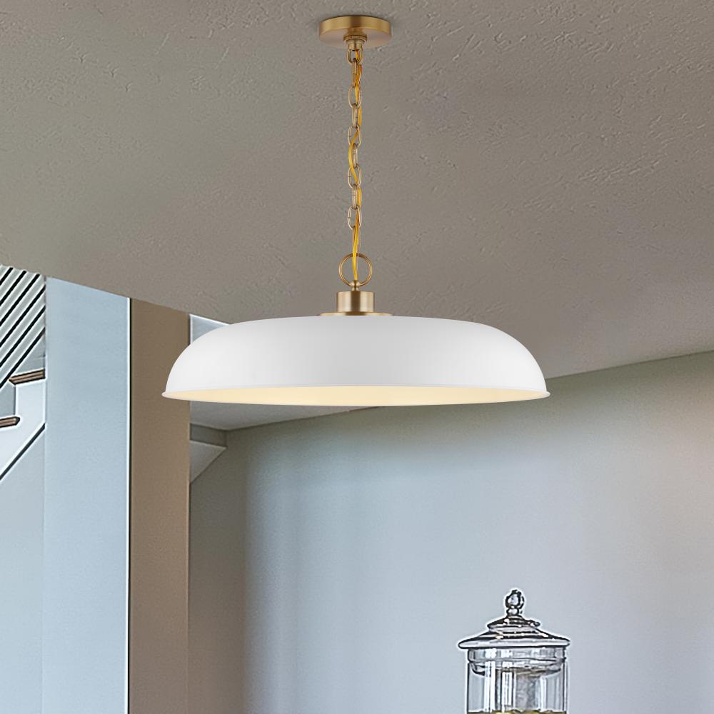 Designed with neutral, clean lines, the Colony large hanging pendant is ideal for an eat-in kitchen, dining room, and even a bedroom. The loft-style shallow pan metal shade is done in matte white, with a matching interior to reflect the downfacing lamp. Th