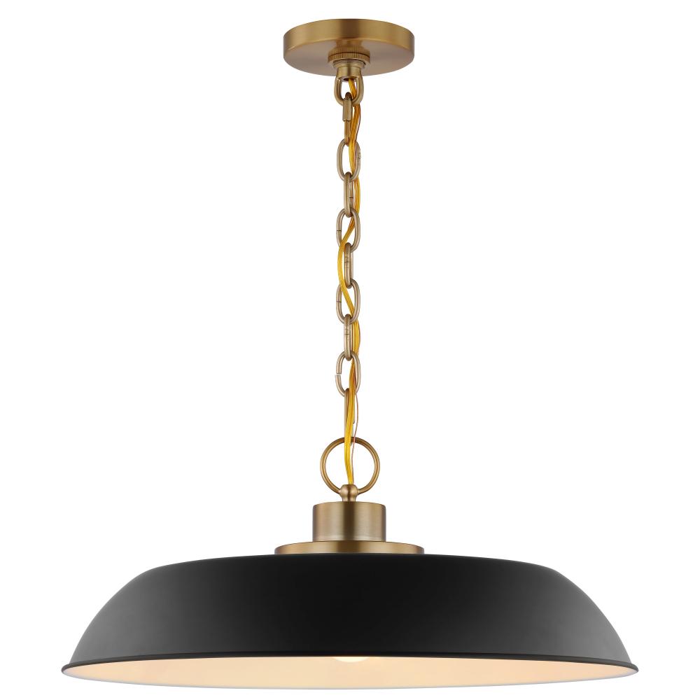 Designed with neutral, clean lines the Colony medium hanging pendant is ideal for an eat-in kitchen, dining room and even a bedroom. The loft-style shallow pan metal shade is finished in matte black, with a white interior to reflect the downfacing lamp. Th