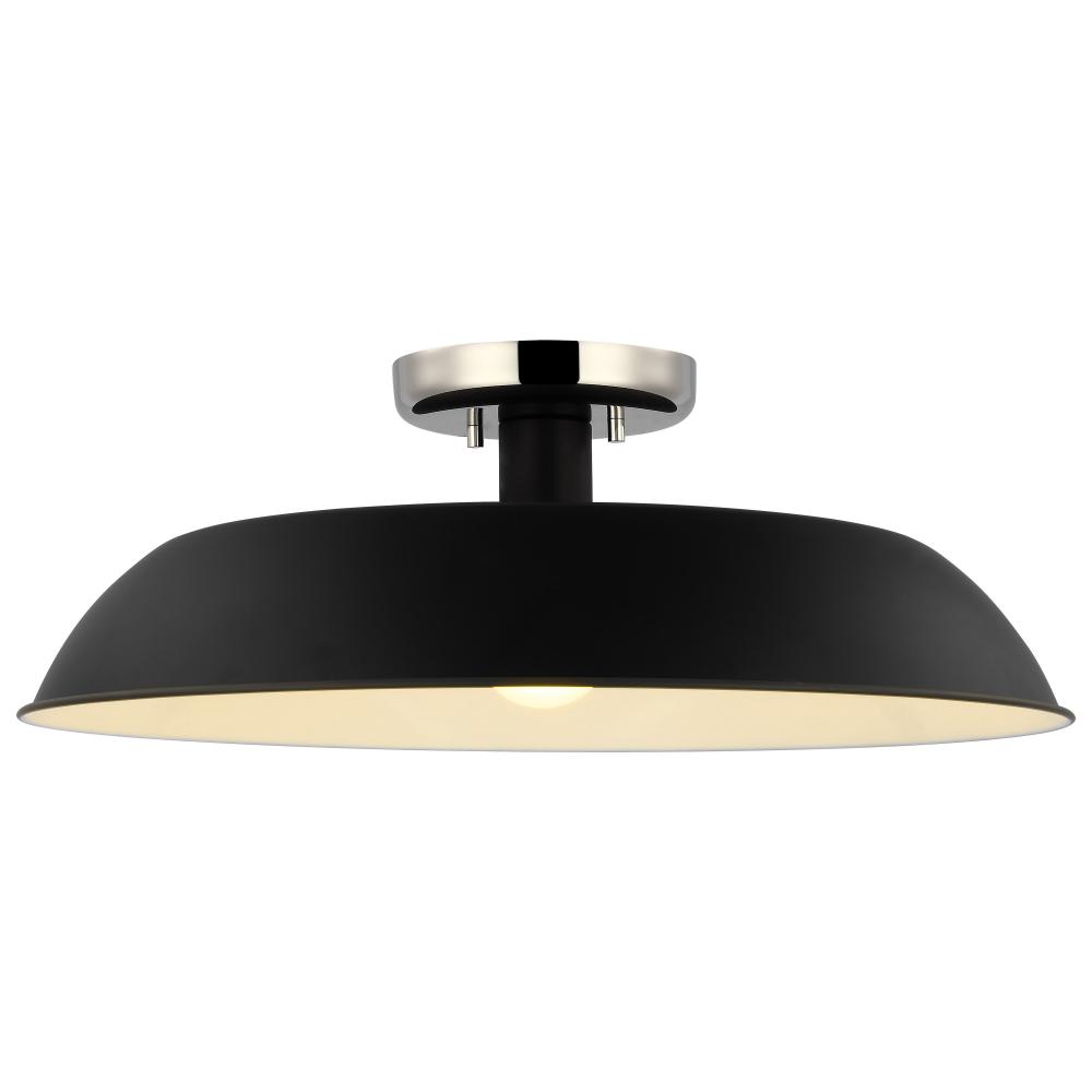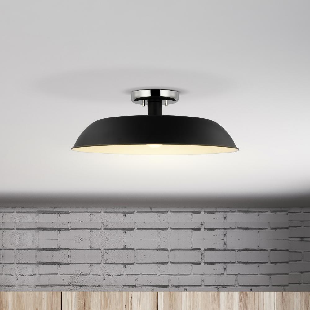 Designed with neutral, clean lines, the Colony 60-7495 medium semi-flush is ideal for an eat-in kitchen, entryway, hallway and even a bedroom. The loft-style shallow pan metal shade is done in matte black, with a white interior to reflect the downfacing la