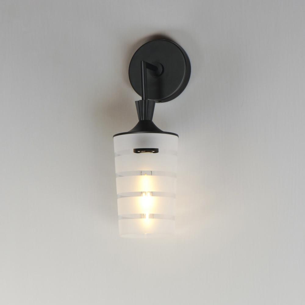A playful grouping of globe and tapered cylinder glass shades feature a distinctive striped pattern as they are held from crown-like fonts. Spiritedly vintage and excitingly modern, this fashionable series of outdoor rated sconces and pendants connects sty