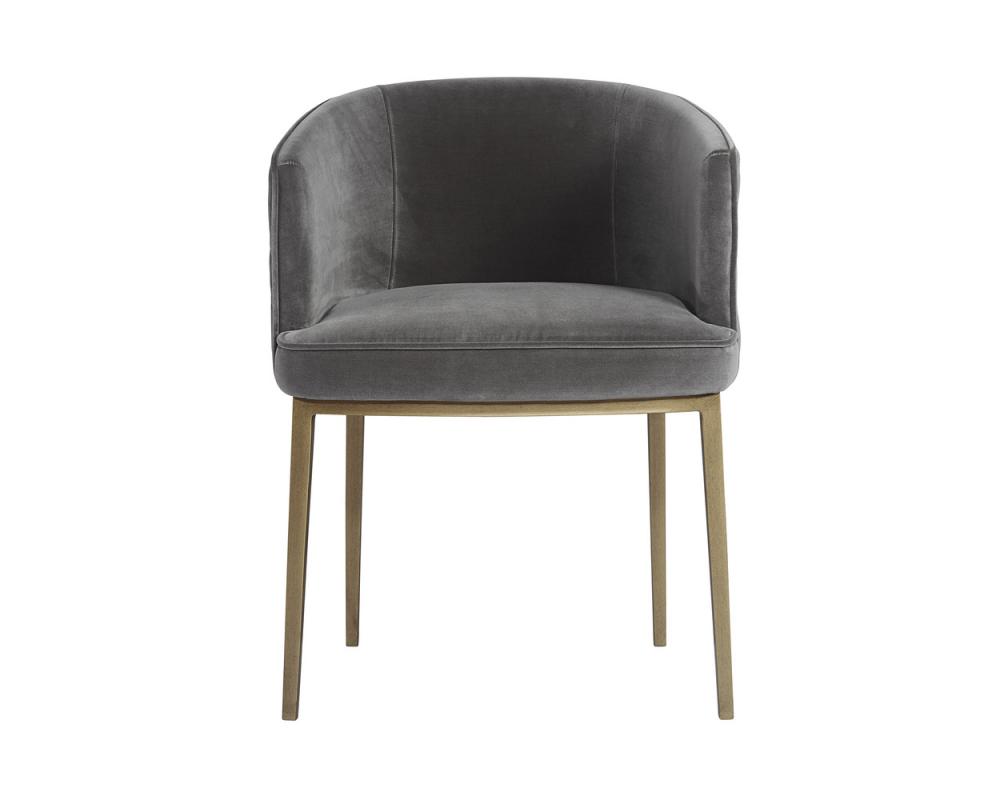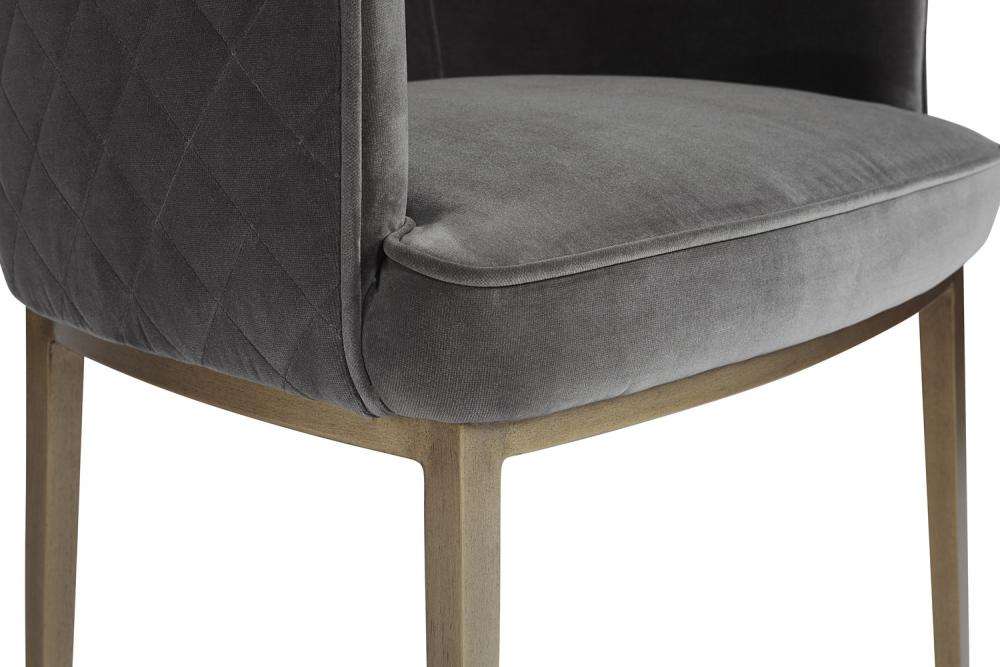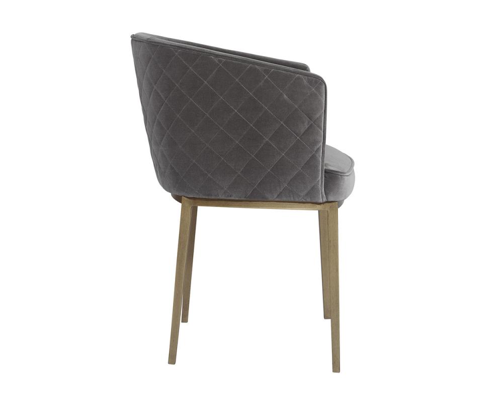 Feminine flair comes to life in this modern dining chair. In blush grey and with elegant diamond stitching on the exterior seatback. An antique brass steel frame completes the look. Also available in polo club stone performance fabric