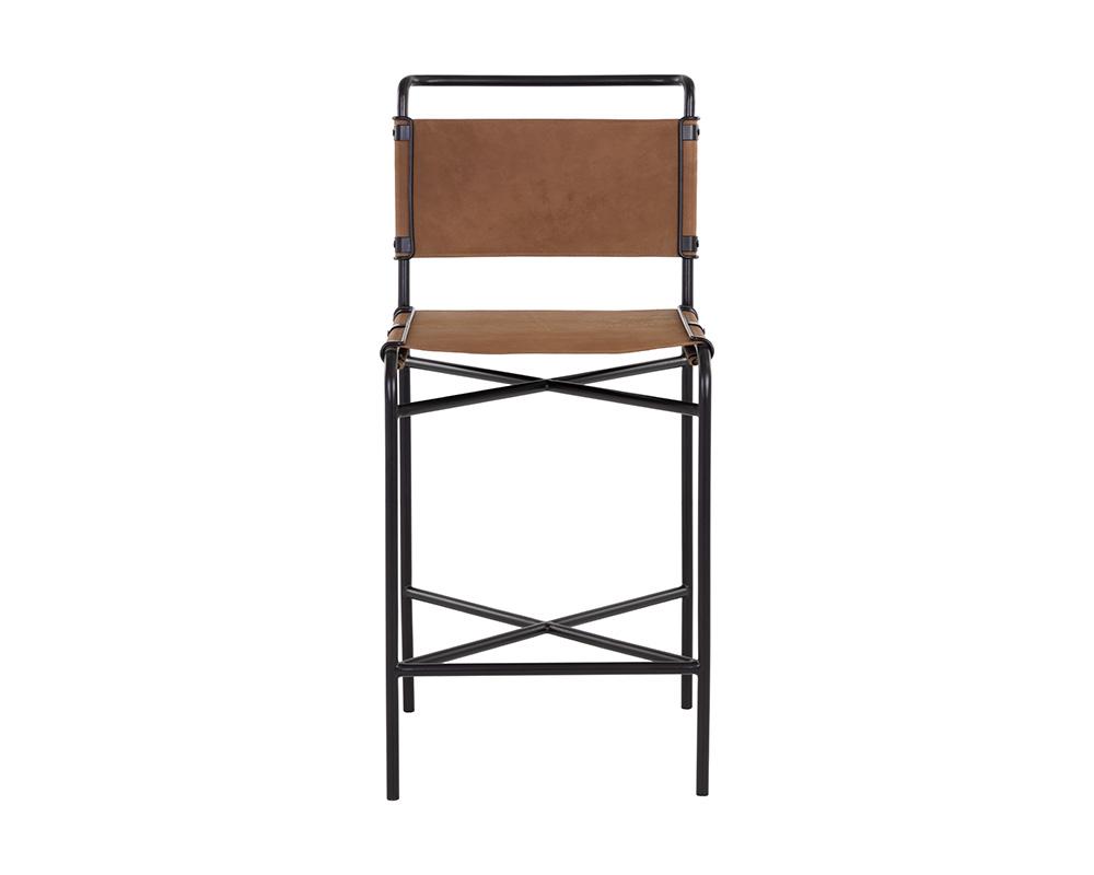Fusing mid-century modern design with a tinge of industrialism, this charming counter stool is a stylish addition to any space. Upholstered in cognac leather and completed with a matte black steel base. Also available in a barstool version. Handle with Care: This design has been crafted with 100% genuine leather. Leather is a natural material; as such, colour variations, markings, wrinkles, grooves and light scratches are acceptable and appreciated characteristics. No two pieces are alike.
