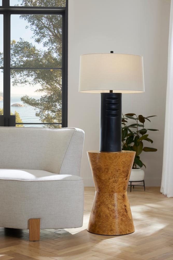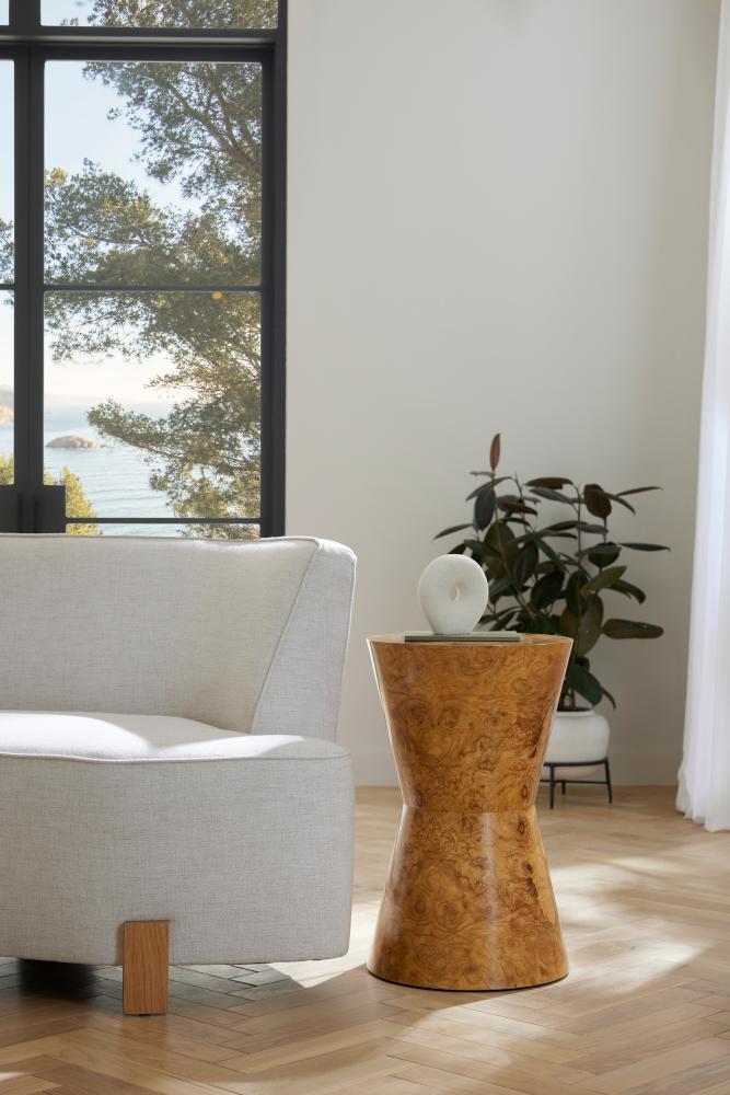 Simple forms meet glam materials in this ’70s-influenced design. A tapered hourglass table is elevated in olive ash burl veneer, book-matched at the top and base for a soothing mirrored effect. Finish will vary.