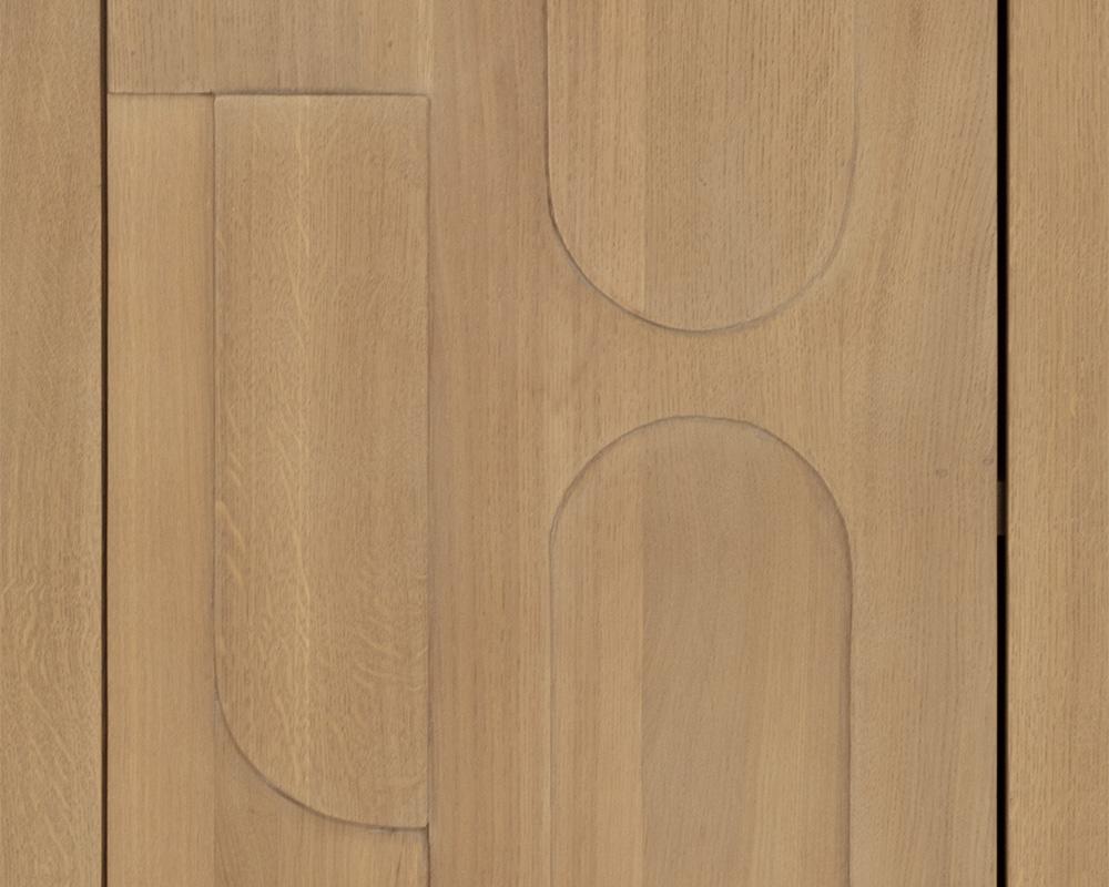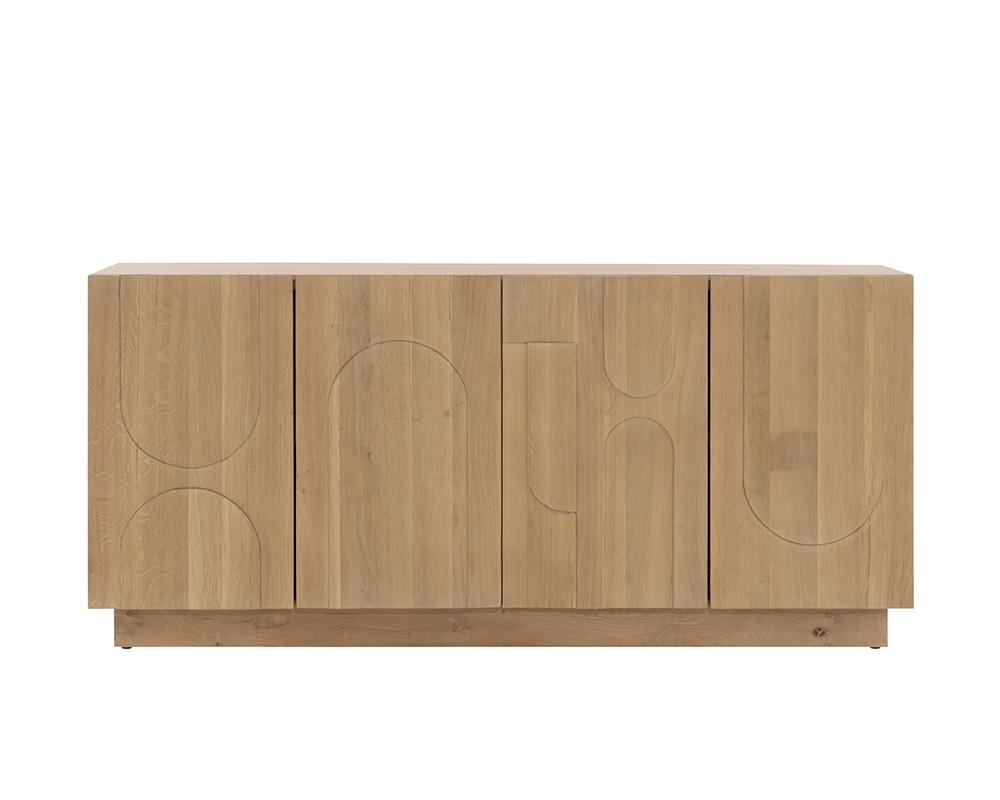 Taking cues from Scandinavian design, the Cove Sideboard is revitalized with beautiful wood patterning. Crafted from a brown solid oak wood frame in a rustic finish, and completed with four cabinets for ample storage space. Anti-tipping kit included. As wood is an organic, porous material, these pieces will contain natural variation of texture and may also exhibit fine indentations and cracks. Wood pieces will also display a disparity of colour and grain, and visible knots and burls that add to the character of each piece.