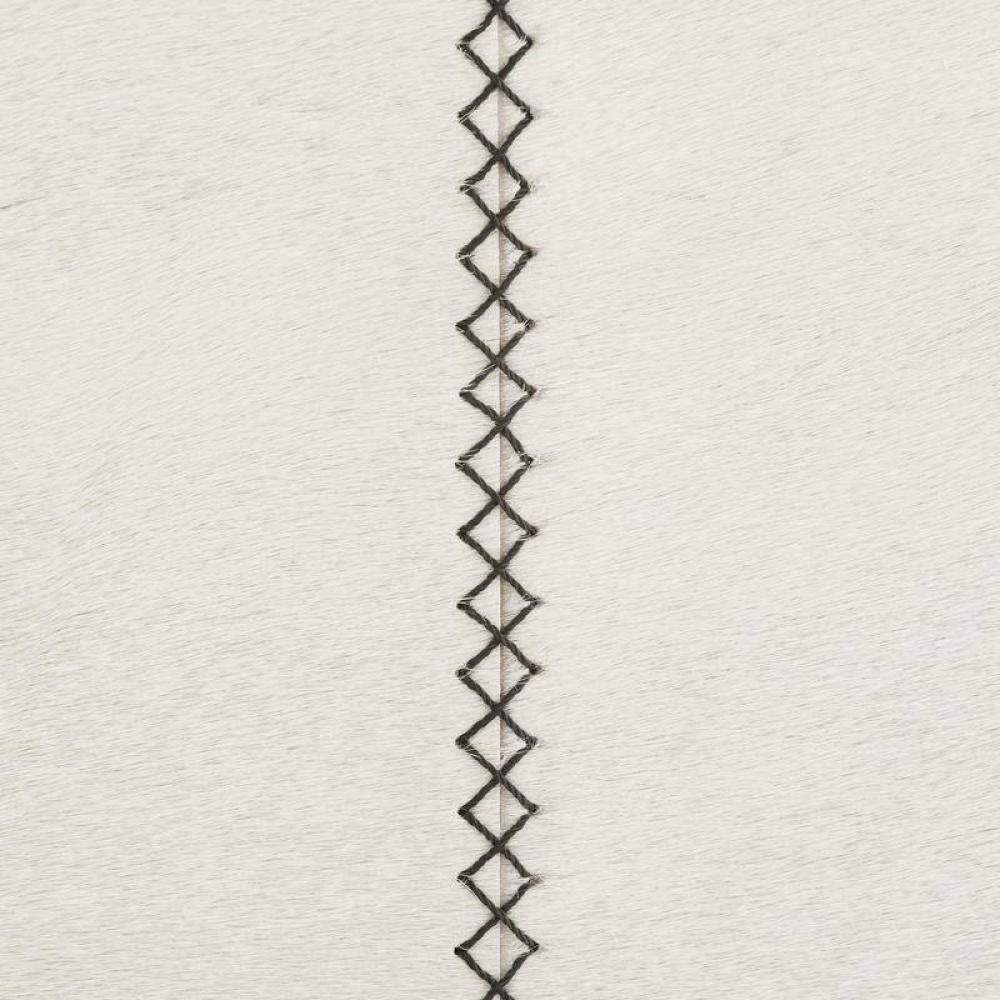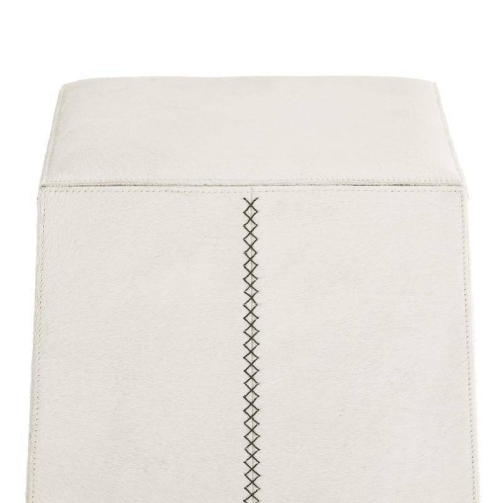 Crafted of white hair-on-hide, this backless bar stool is a tactile delight. A mitered whipstitch creates a racing stripe down the center of each side, while slim antique brass bridges add contrast and support to this minimal design. Hide will vary.