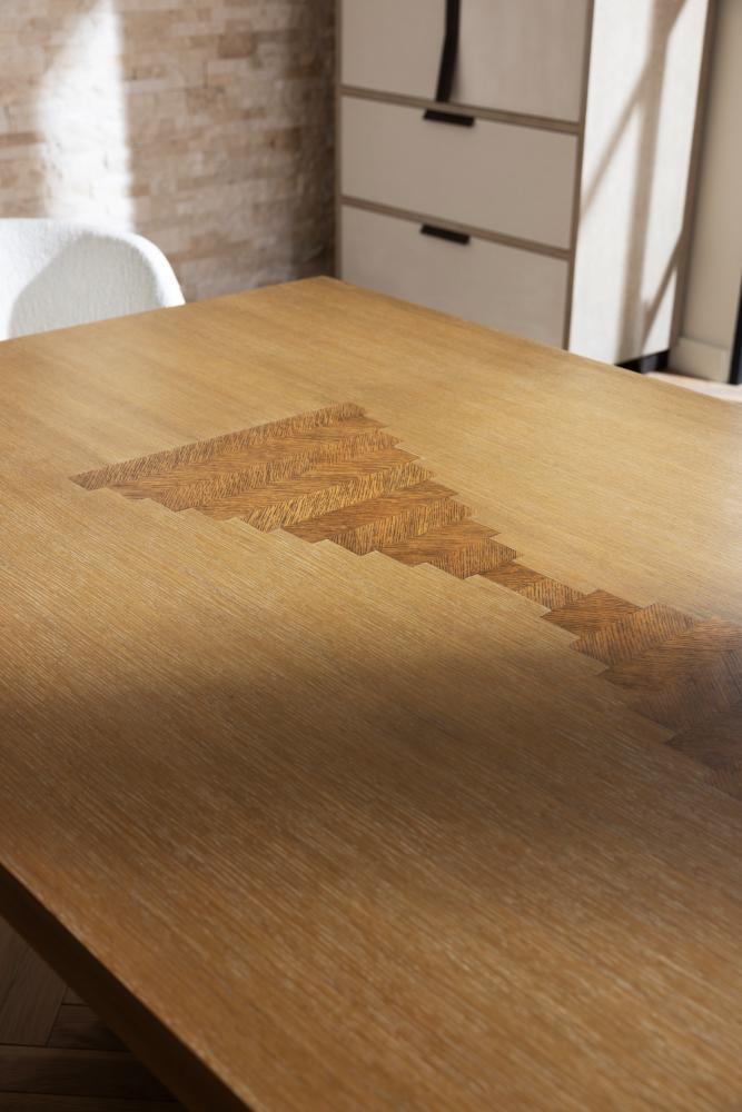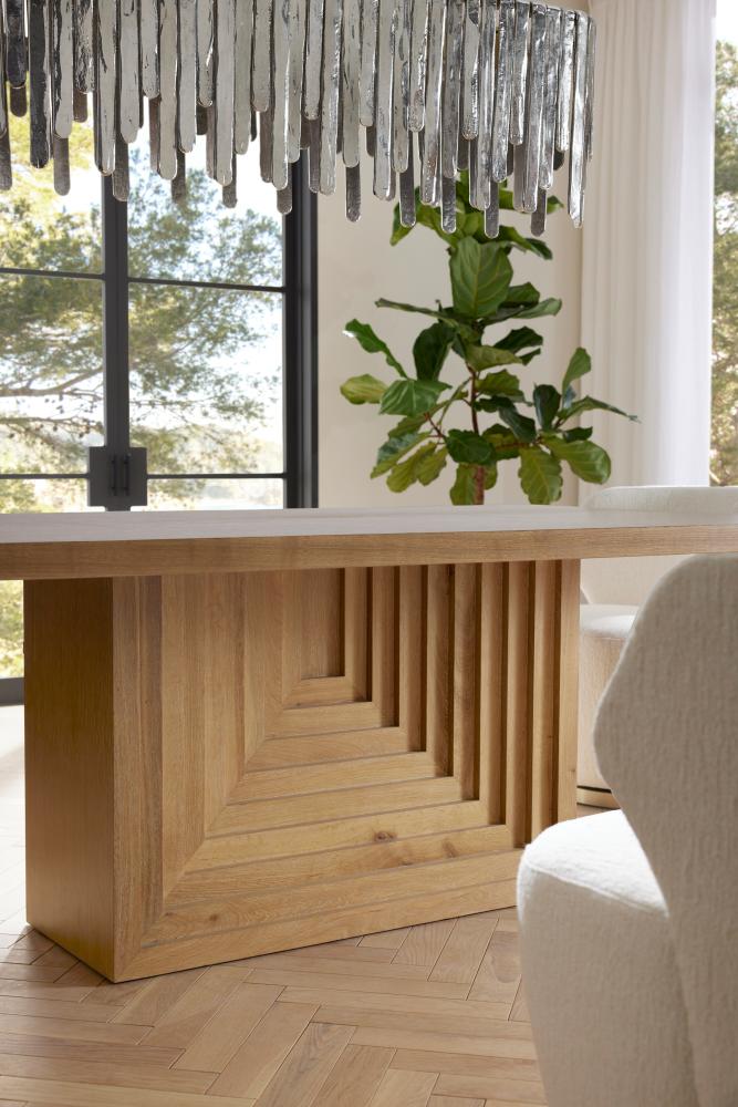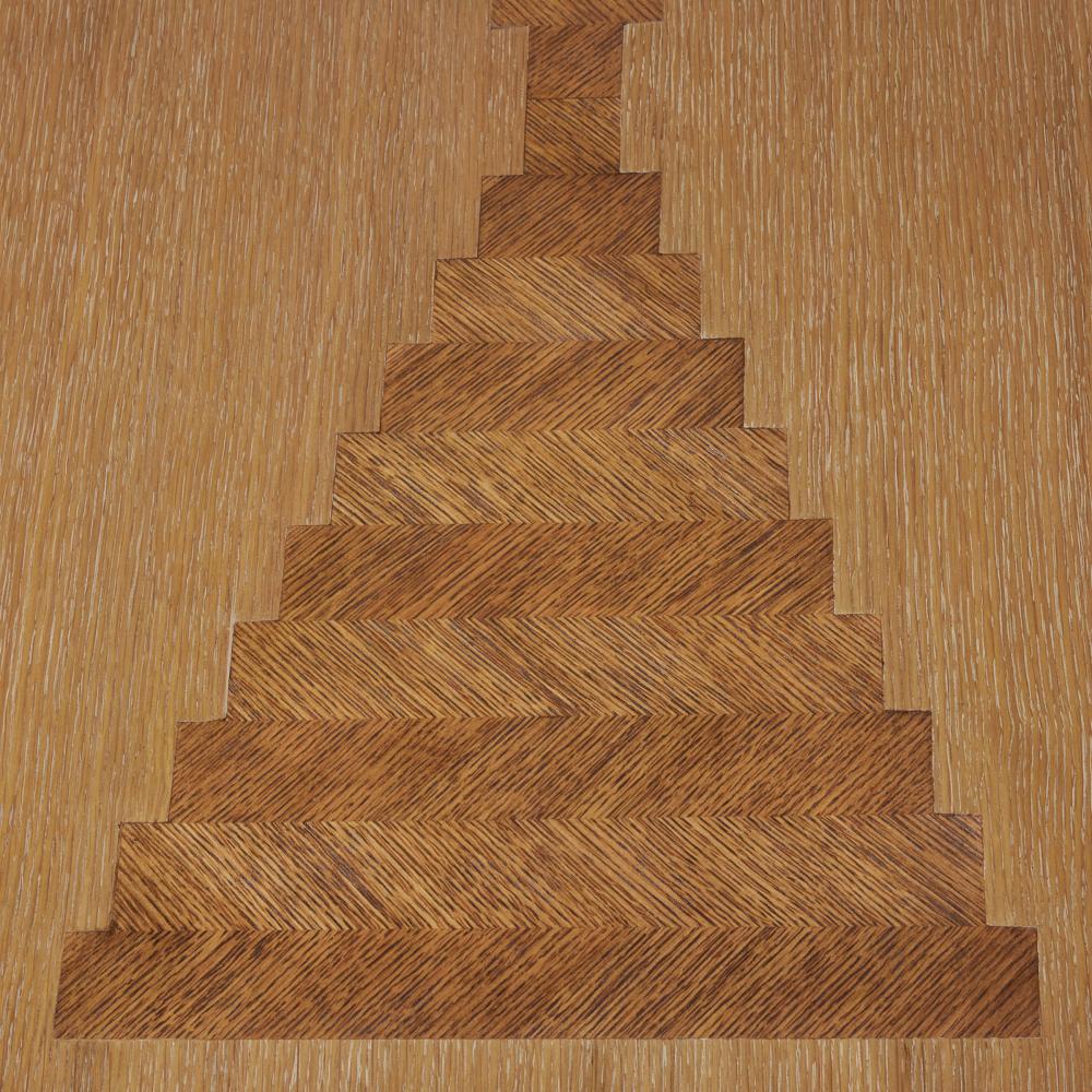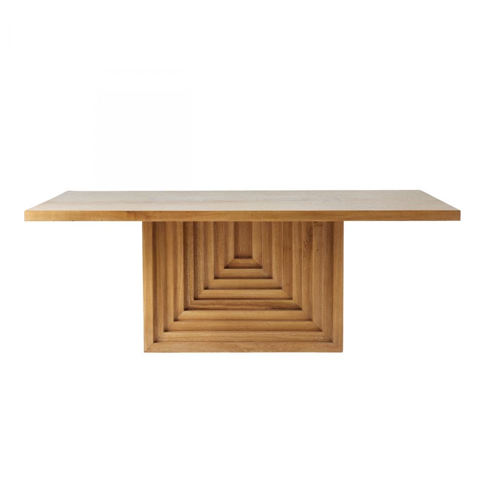 We over scaled the dimensions of a rectangular pedestal table to make it a monumental centerpiece. A stepped, reversed pyramid base offers a ceremonial quality, while the oyster-finished oak veneer top is luxuriously detailed with intriguing, mirrored insets of dark oyster oak veneer. Finish will vary.