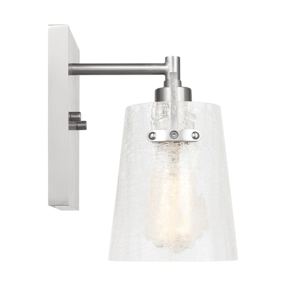 Add a bright burst of light where you need it most with the stylish Drew & Jonathan Crofton wall light, featuring a sleek rectangular metal backplate and crackle clear glass shade. Made to coordinate across a broader range of bath hardware and design styles, the Crofton is available in four popular finishes, Brushed Steel, Chrome, Midnight Black, and Satin Brass. This light looks great on its own or installed above a bathroom vanity, and the glass shade makes it ideal for filament bulbs. This fixture may be mounted in the up or down position, and is cETL listed for damp locations, making it the perfect lighting solution for any space.