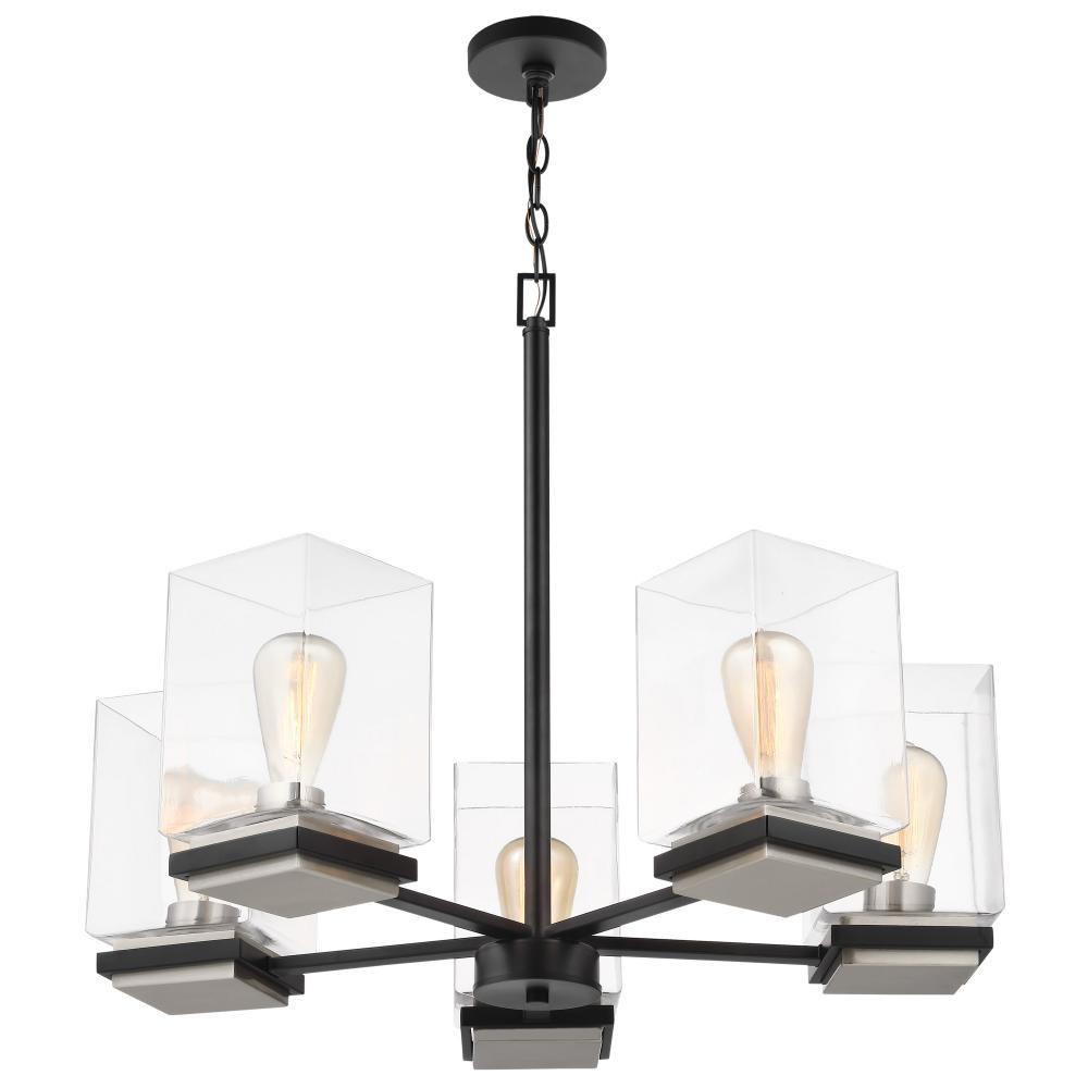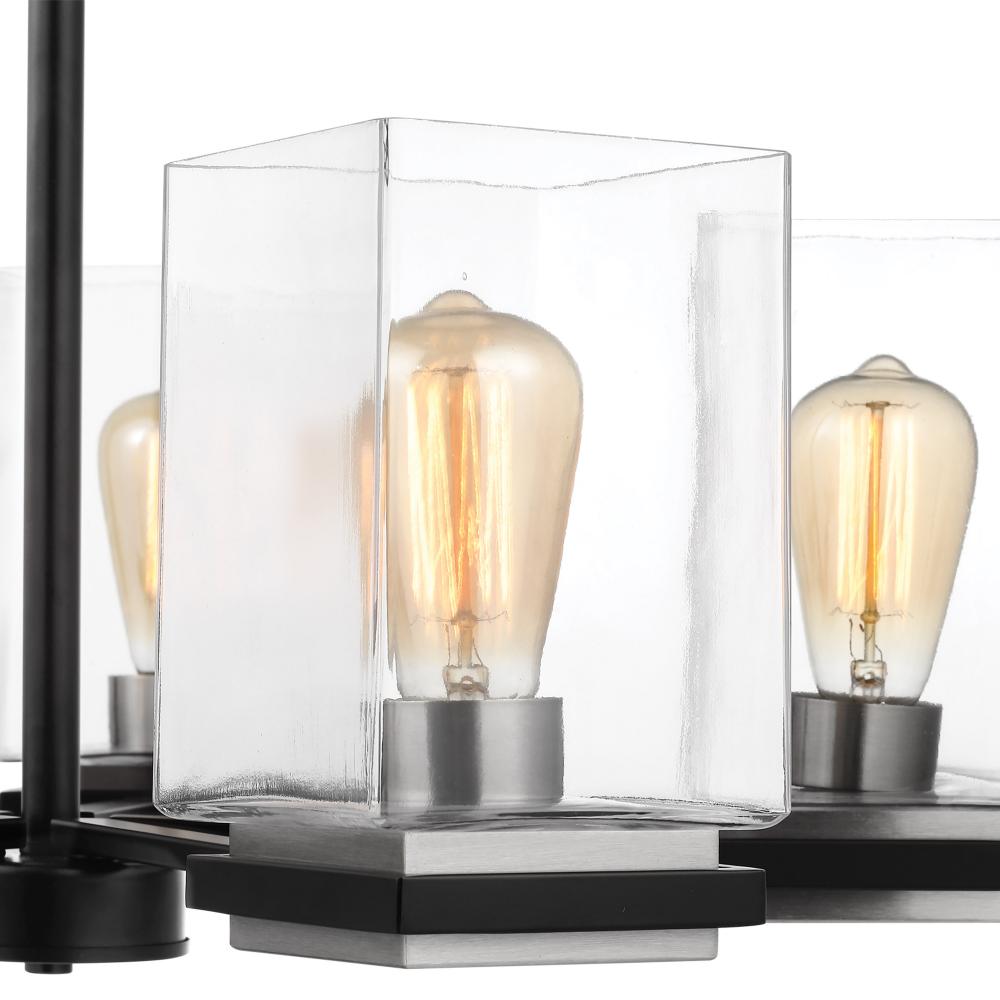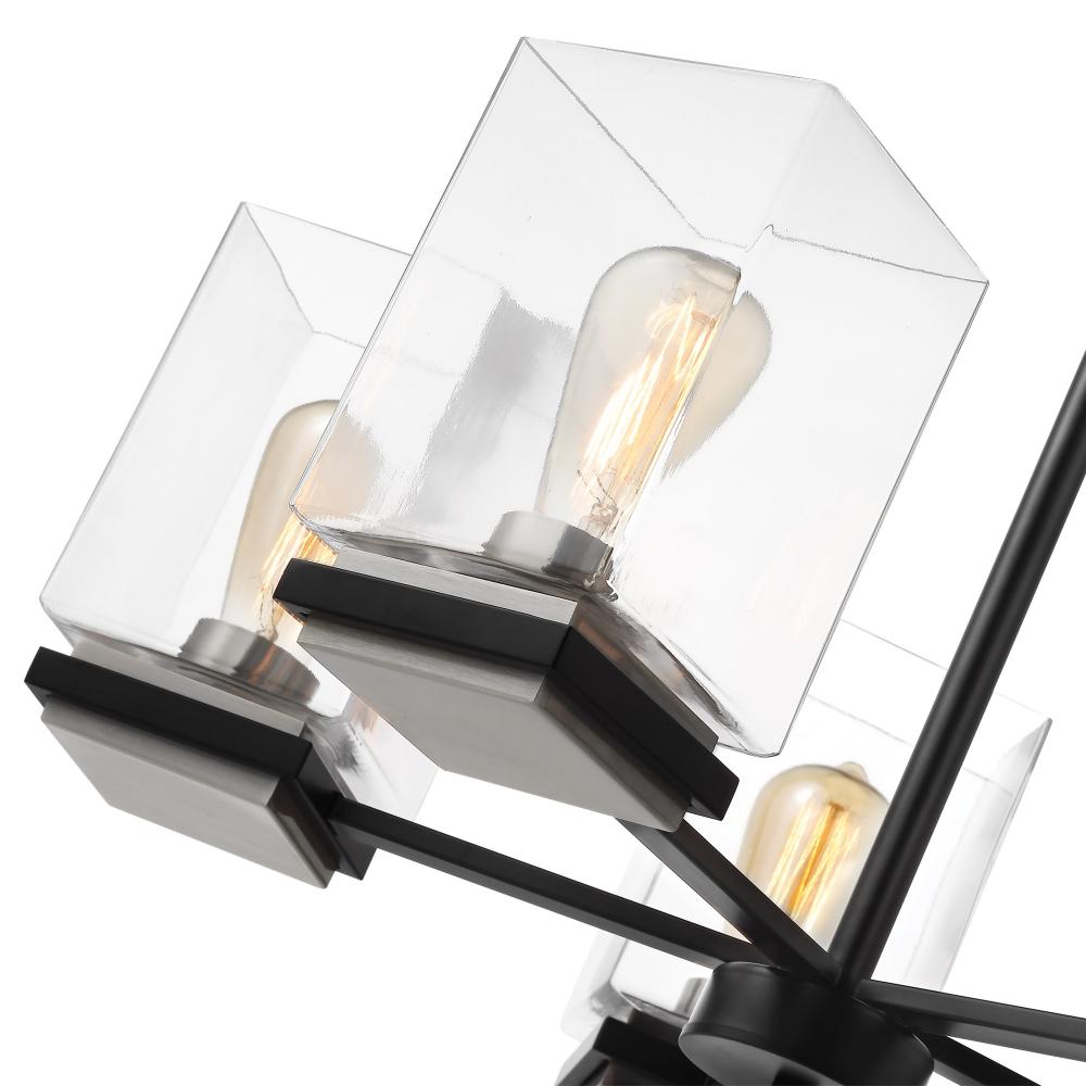 A combination of glass and metal comes together to create the stunning design of the Crossroad 60-7656 chandelier. The square, clear glass shades showcase the bulbs. The sockets and base are finished in brushed nickel to contrast beautifully with the matte