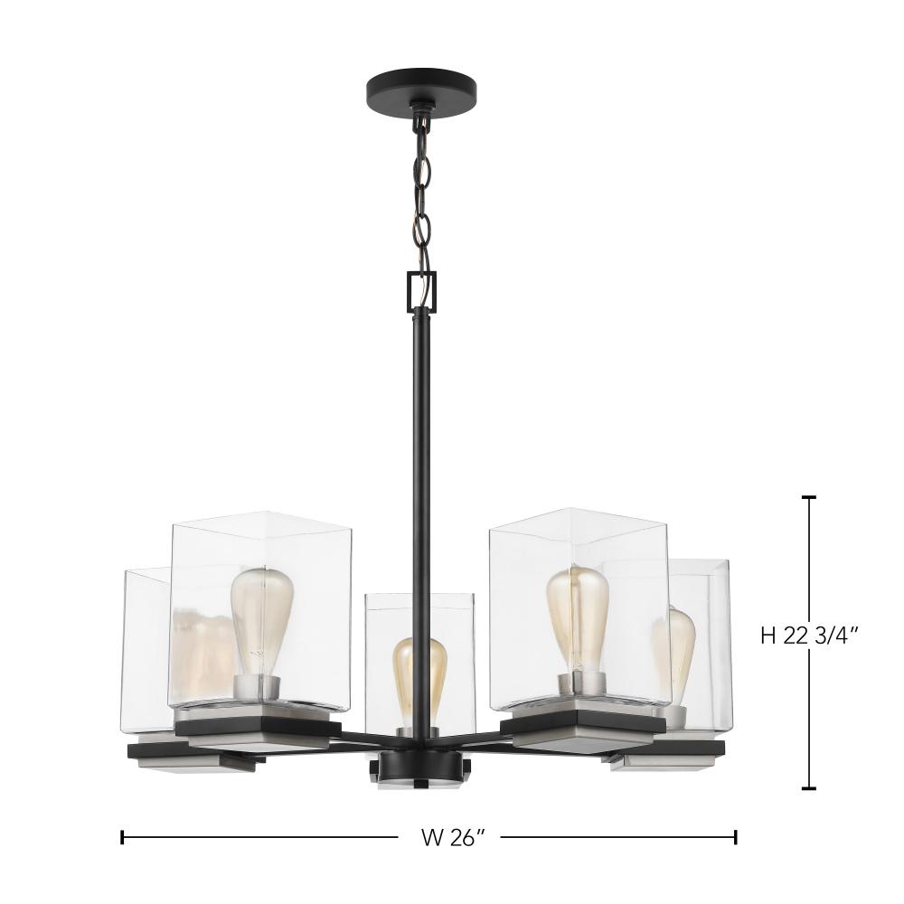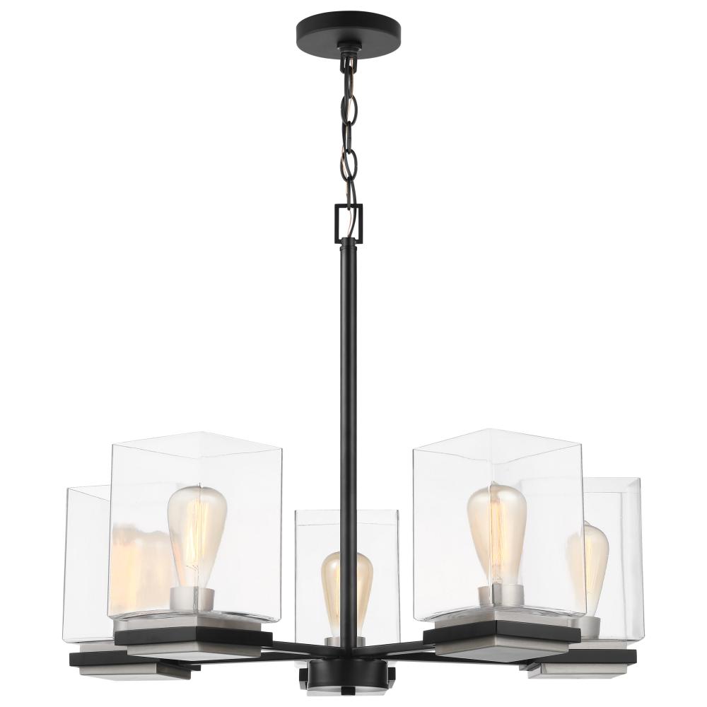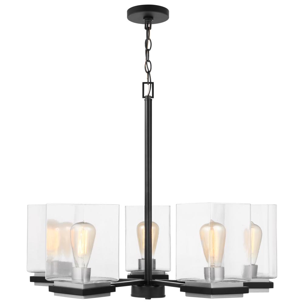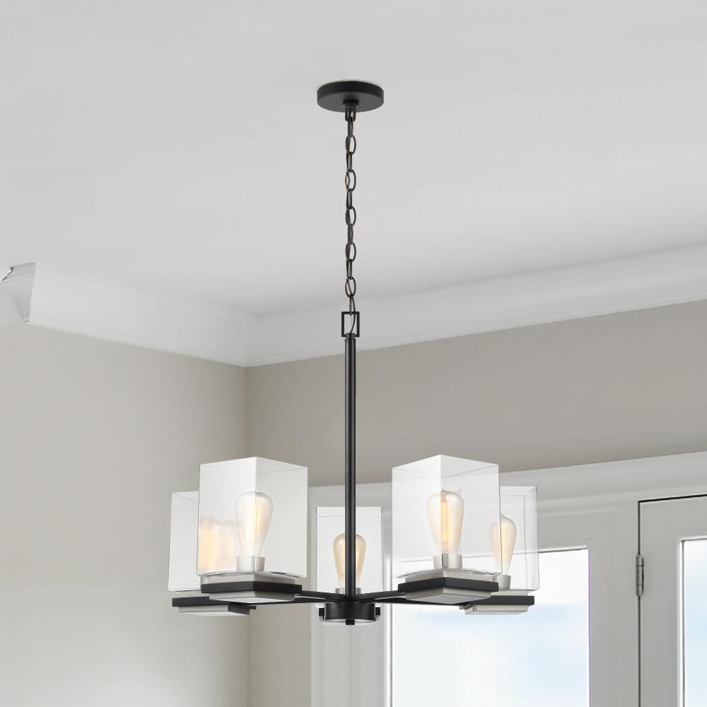 A combination of glass and metal comes together to create the stunning design of the Crossroad 60-7656 chandelier. The square, clear glass shades showcase the bulbs. The sockets and base are finished in brushed nickel to contrast beautifully with the matte