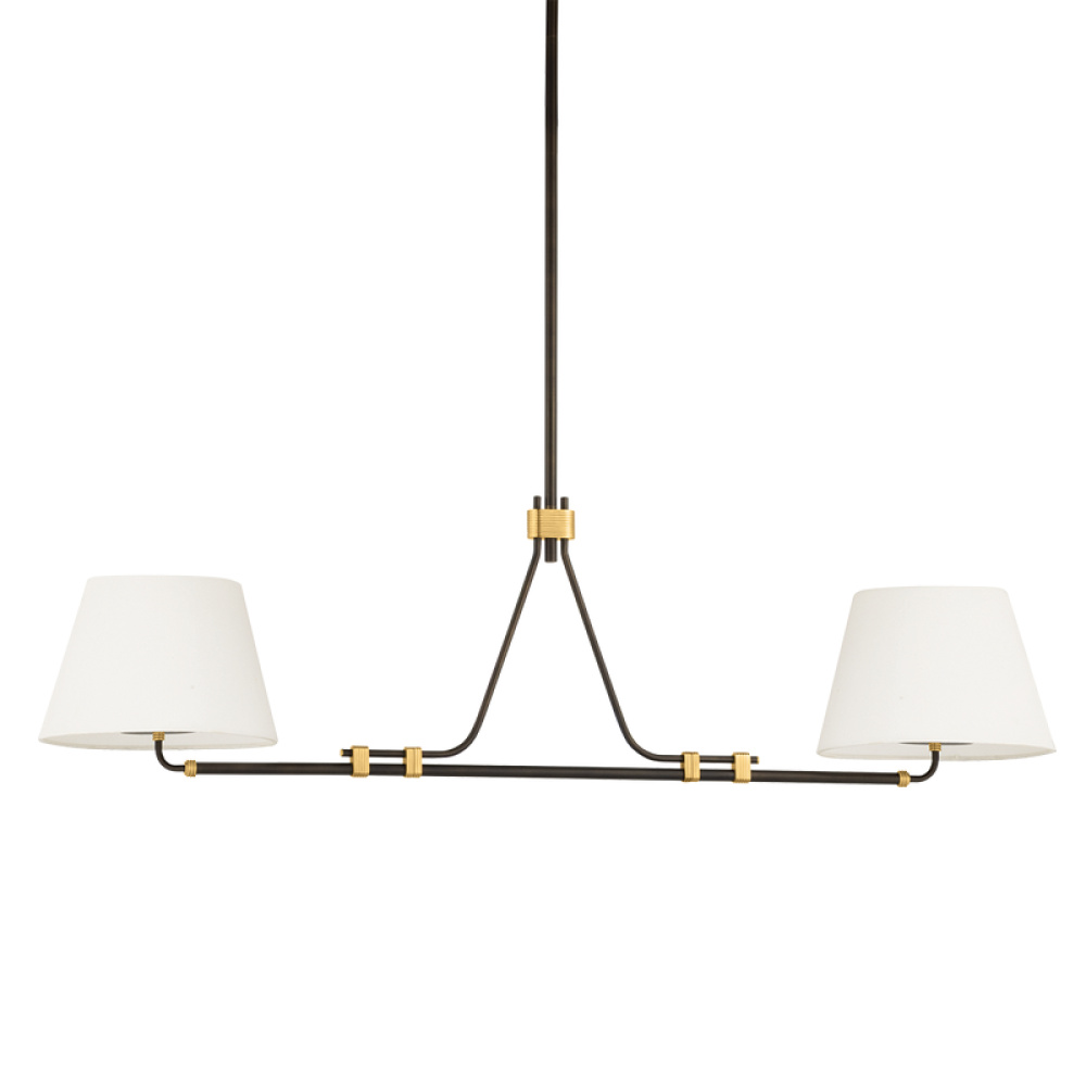 Inspired by modern mechanics, the Crown Heights family features exposed connection points with eye-catching mixed metal finishes. The slender metal frame is finished in Dark Bronze with lighter Aged Brass racetrack accents that speak to the design’s industrial signature. Crown Heights is available as a wall sconce, a 2-light island pendant, and a 4-light chandelier.