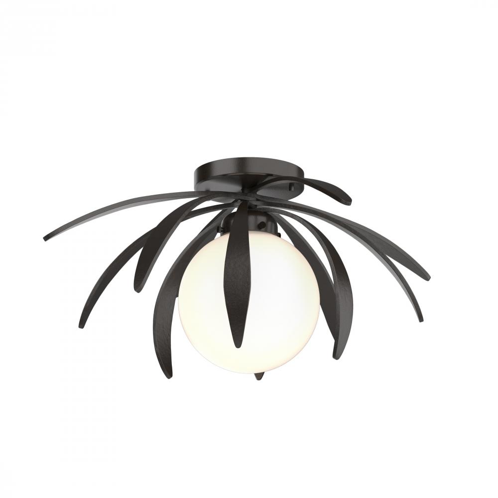 True to the beauty of its namesake flower, the Dahlia Flush Mount fixture provides a sculptural botanic aesthetic. Handcrafted forged steel “petals” flare outward and downward to embrace a glass globe containing a singular light source at its center. Available in 9 standard finishes. In addition to the flush mount, the Dahlia Collection includes chandeliers and mini pendant options to grace any space. Can also be wall mounted as a sconce.