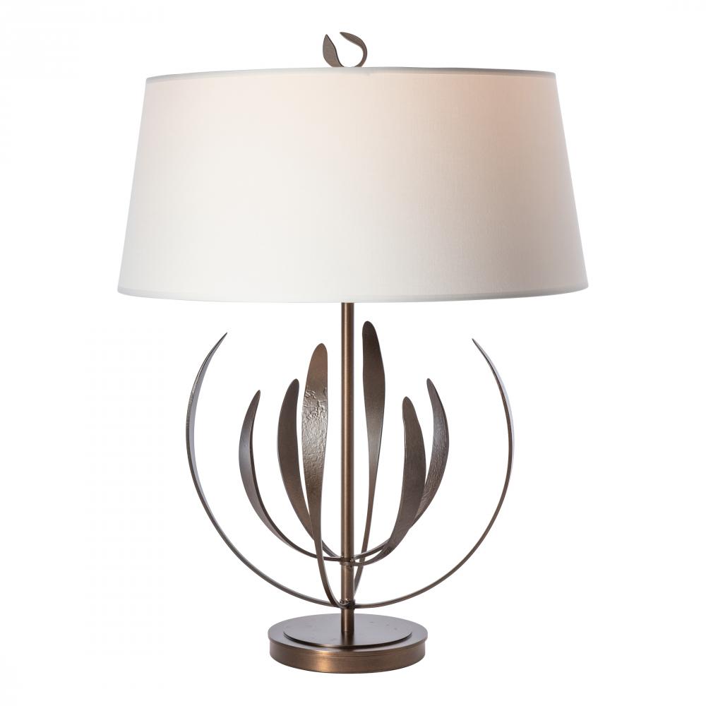From our iconic Dahlia pendant comes this stunning table lamp designed by Paul Marr Hilliard. With two tiers of four upward reaching, delicate "petals" each, the Dahlia Table Lamp exudes grace and elegance. Petals are handcrafted by Vermont artisans in the 1800º red-hot fires of the forge. The finial detail is pure perfection, peeking out from above its beautiful fabric shade.