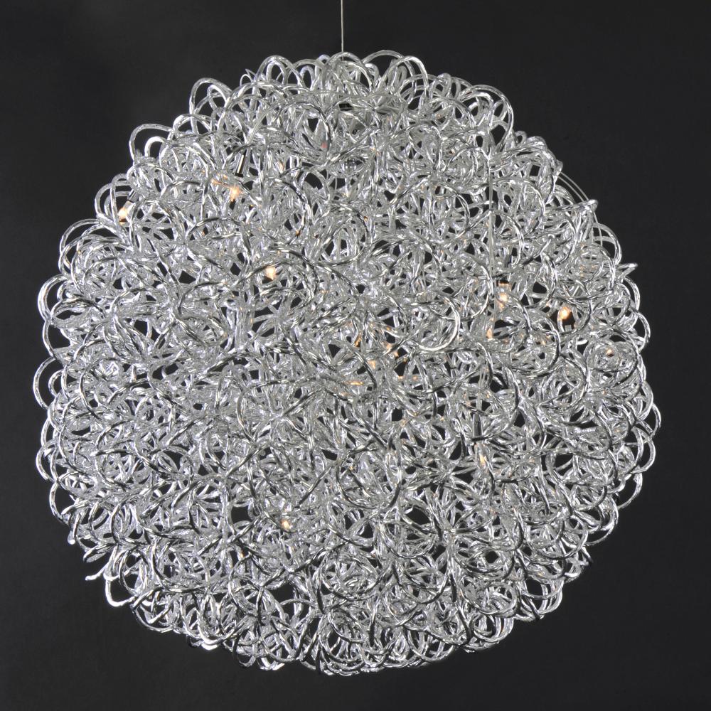 Sculptures created from Polished Chrome aluminum rods are formed by hand into a mod-silhouette, perfect for loft living and cosmopolitan lifestyles. Woven through the interior are strings of clear G4 Xenon lamps that add sparkle as they reflect off of the