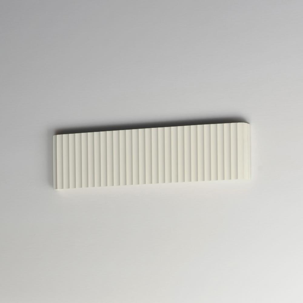 Long spans of fluted concrete panels blend Western classicism with modern technology. Scalloped concrete is finished in a Chalky White finish and suitable for damp locations. Choose from stem hung pendants or backlit wall panels that provide ambient light