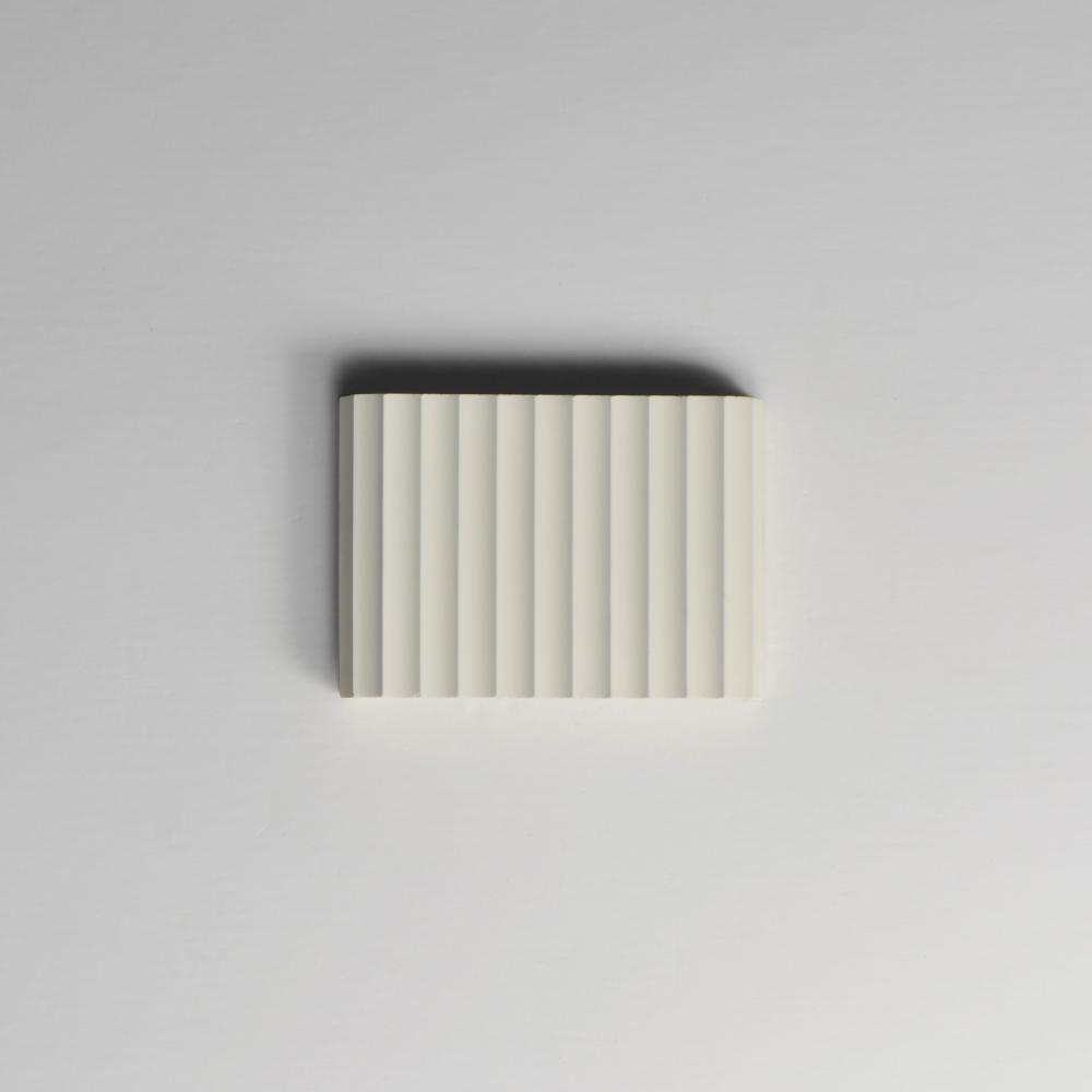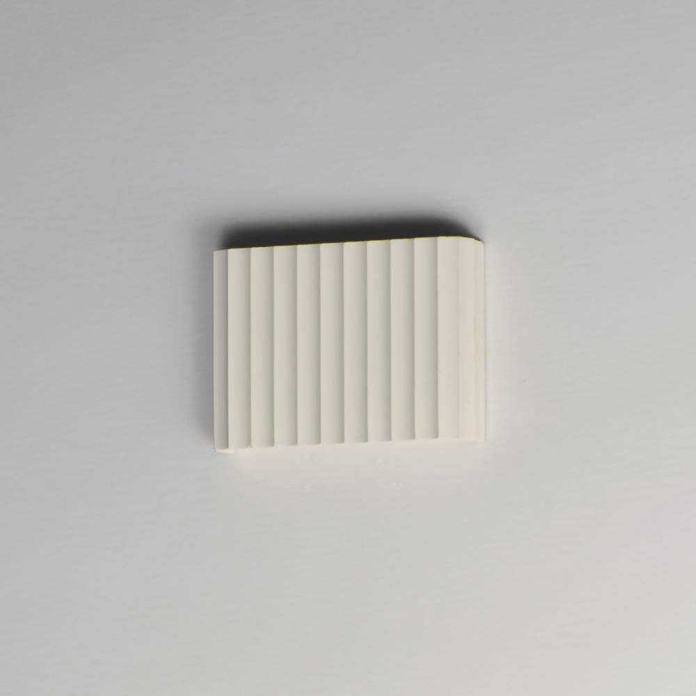 Long spans of fluted concrete panels blend Western classicism with modern technology. Scalloped concrete is finished in a Chalky White finish and suitable for damp locations. Choose from stem hung pendants or backlit wall panels that provide ambient light