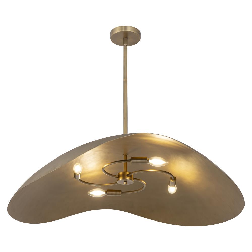 Large, cast metal shades evoke an ancient and timeless heritage. The light source is concealed within the shades casting a warm, ambient glow downward. Handcrafted and dramatically scaled, the rough texture is softened by its folding form in a multi-tonal
