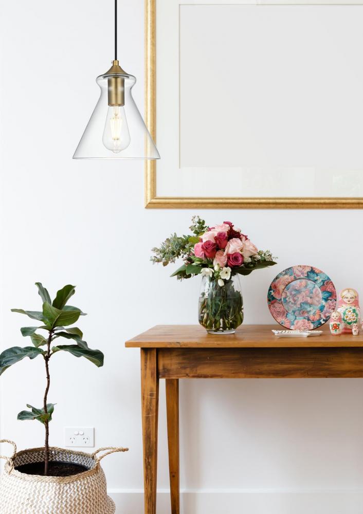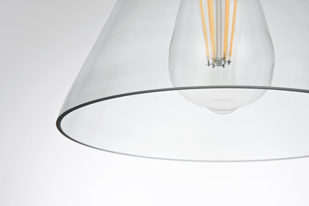 Features a clear glass shade, offering bright, unobstructed light and a clean, modern look.