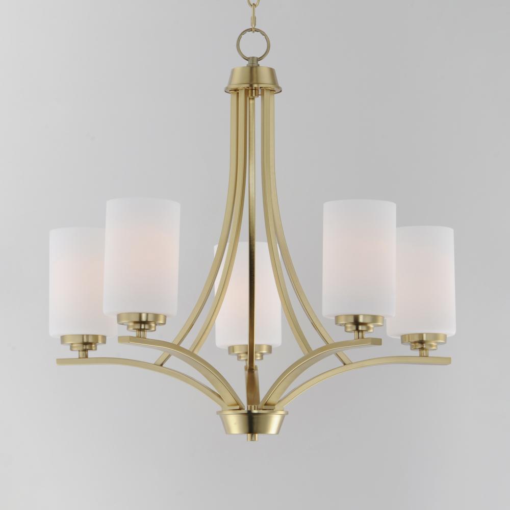 Low sloping arms of rectilinear tubing is finished in a variety of options that include Satin Nickel, Oil Rubbed Bronze, Matte Black, and a contemporary Satin Brass finish. Tall, cylindrical Satin White glass shades soften the light source within. Offered