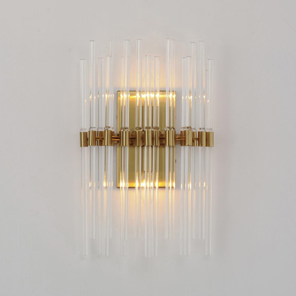The composition of Clear glass rods are elegantly supported by thin radial arms of staggered lengths to create an iridescent motif that is truly Divine. Finished in Polished Nickel or Heritage Brass, the simplicity of this design delivers a crisp lighting