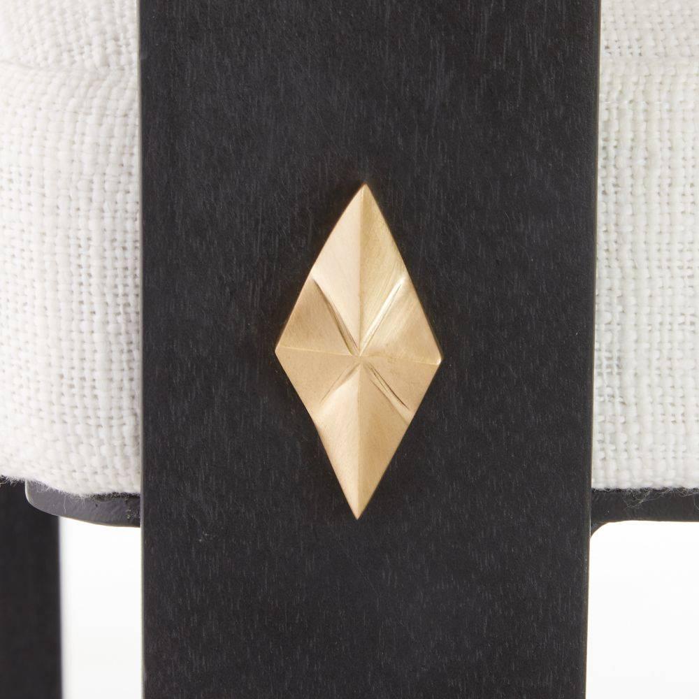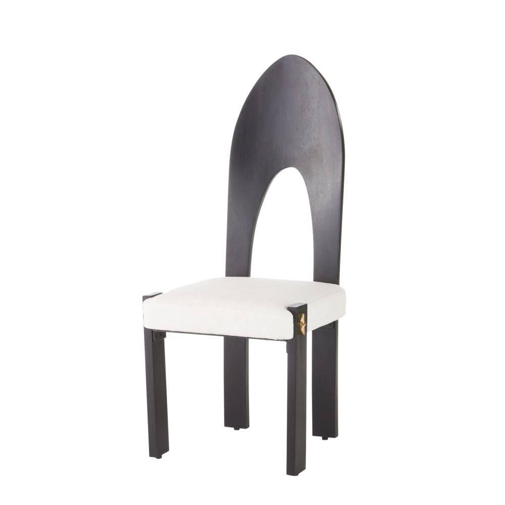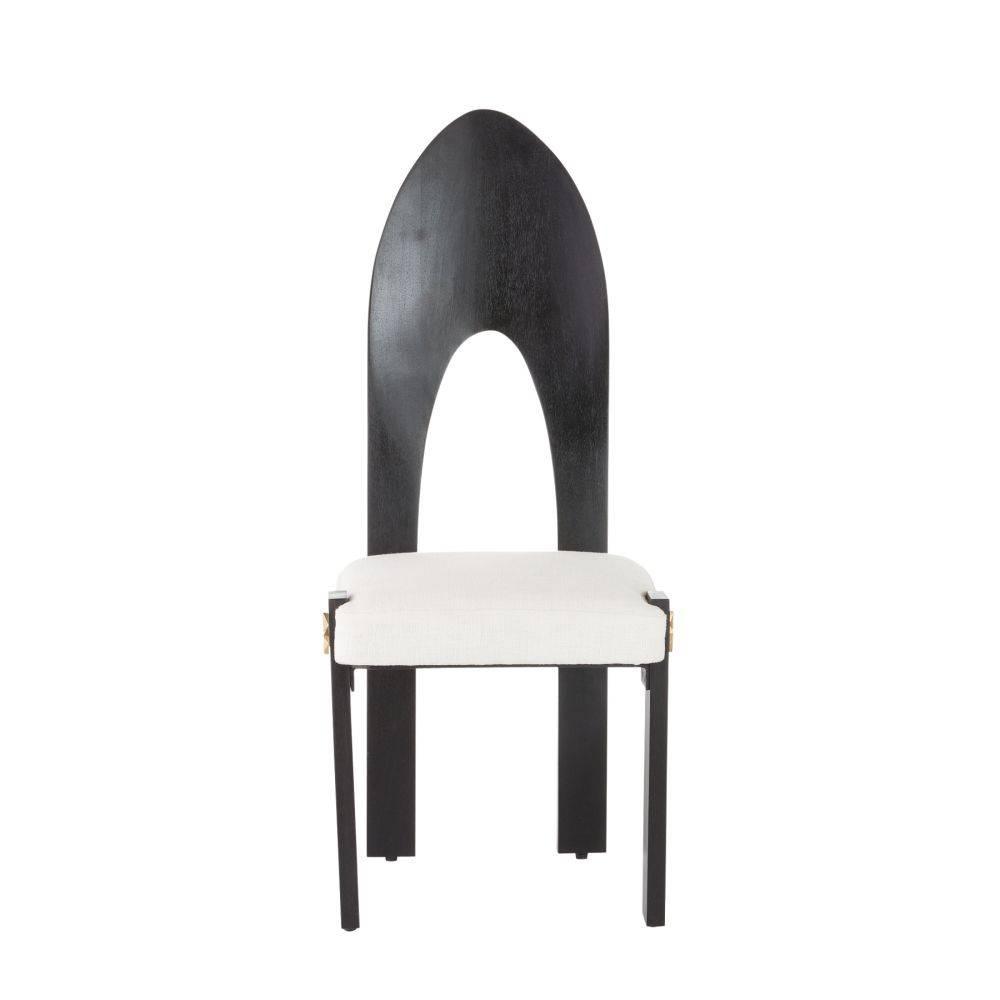 Inspired by tribal art, the confident Aztec arch back of the Durango adds a touch of drama to the dining room. Accented with abstract brass diamond detailing on each front leg, this mango wood essential is stained in a deep ebony hue. Finished with textural chantilly texture seating that is padded for comfort. Finish will vary.