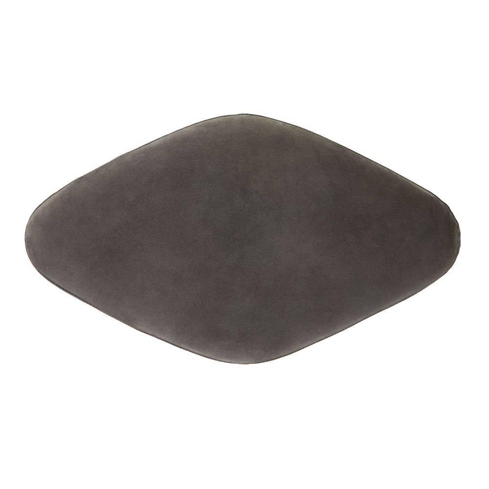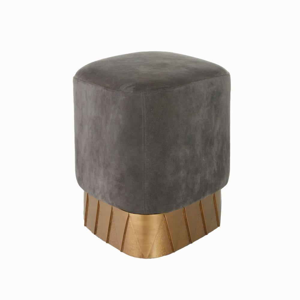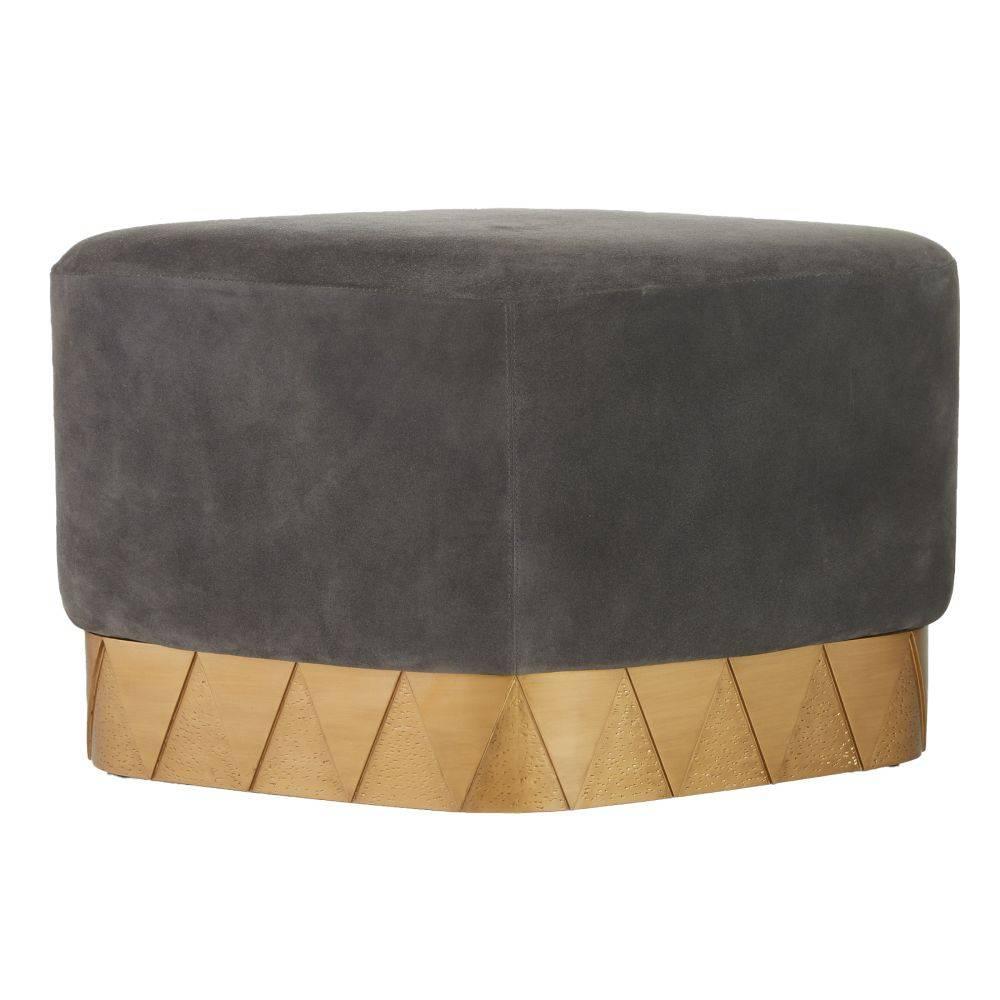 We took a cue from the lines of Art Deco architecture for a rhombus-shaped ottoman of lush slate grey suede. Poised on a folded antique brass base, its muscular details and dimpled diamond texture recall the fine craftsmanship found in armor. Designed with soft corners to display horizontally or in a pair. Suede will vary.