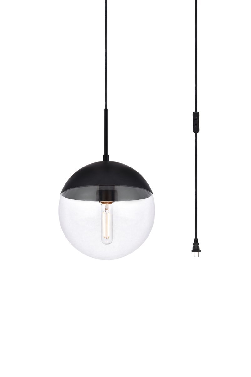Pendant lamp features a black and clear glass.