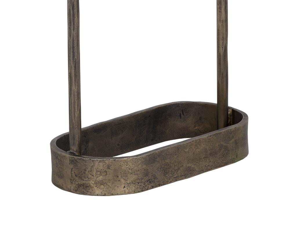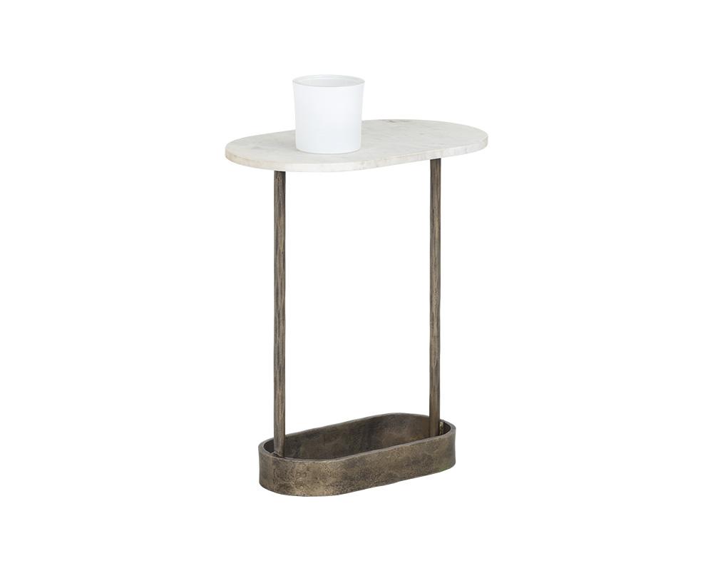 A side table inspired by global travels with a minimalist silhouette. Features a white marble tabletop with a structured hammered iron base in an antique brass finish. Made in India: With refined craftsmanship, this design was brought to life by skilled local artisans. By nature, these materials develop unique imperfections such as fissures, markings and colour variations for a truly one-of-a-kind piece.