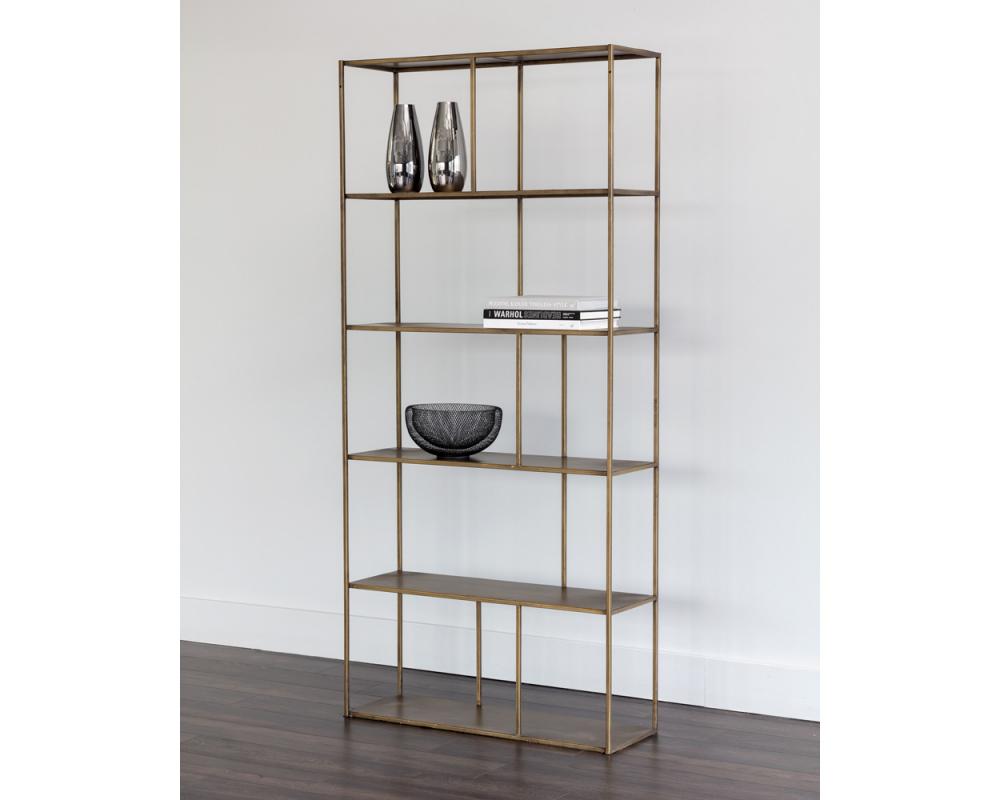 Add style and warmth to living and office spaces with this well-designed iron bookcase in a brushed antique brass finish. Can be placed in pairs or multiples for added impact and functionality. Also available in a smaller size. Anti-tipping kit included.