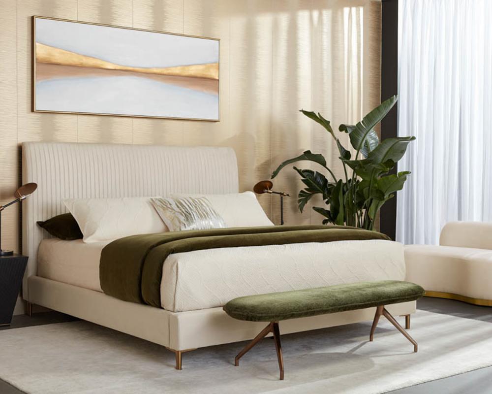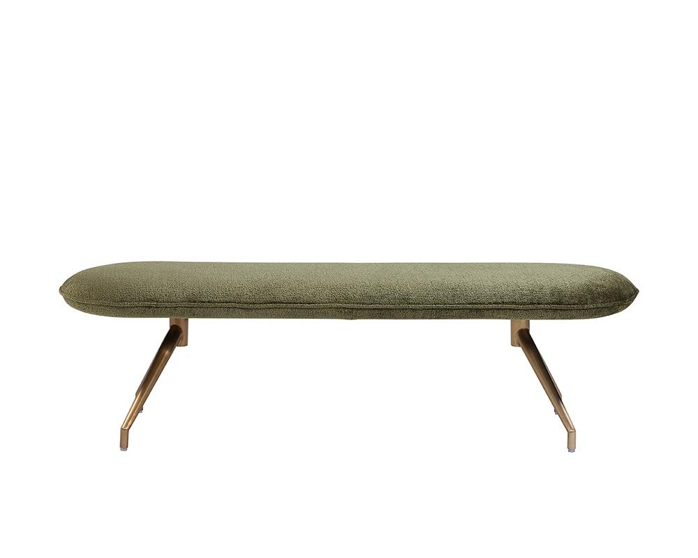 With a stunning oval design, this modern bench will add style and function to any space. Stocked in bergen olive and taupe fabrics, and completed with an antique brass powder coated stainless steel base.