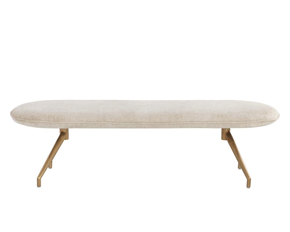With a stunning oval design, this modern bench will add style and function to any space. Stocked in bergen taupe and olive fabrics, and completed with an antique brass powder coated stainless steel base.
