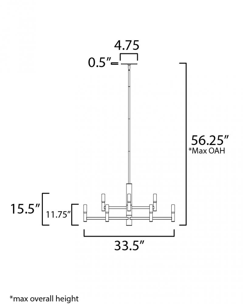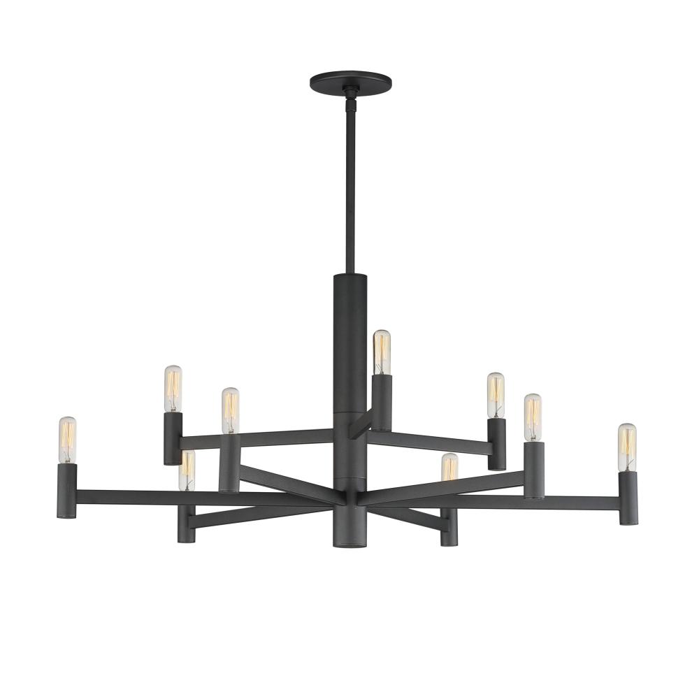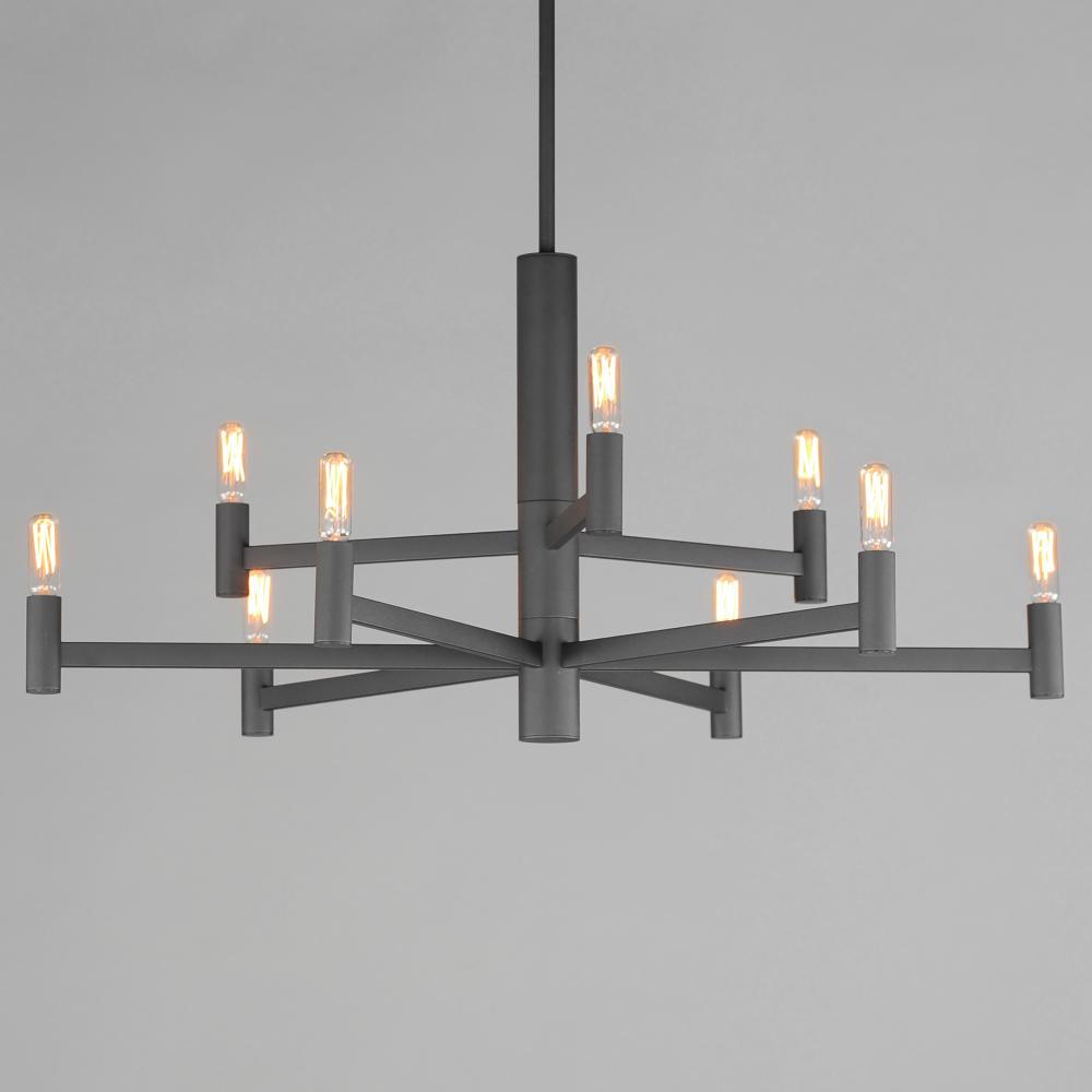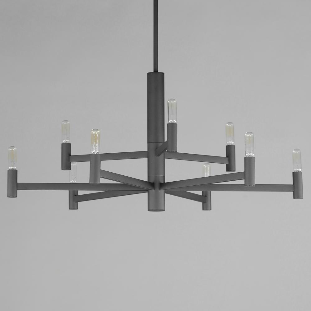 Straight extensions of rectilinear arms emanate from a cylindrical center housing in this transitional design. The candelabra is made in a corresponding cylindrical form playing into the geometries of this streamlined chandelier design. Available in a text