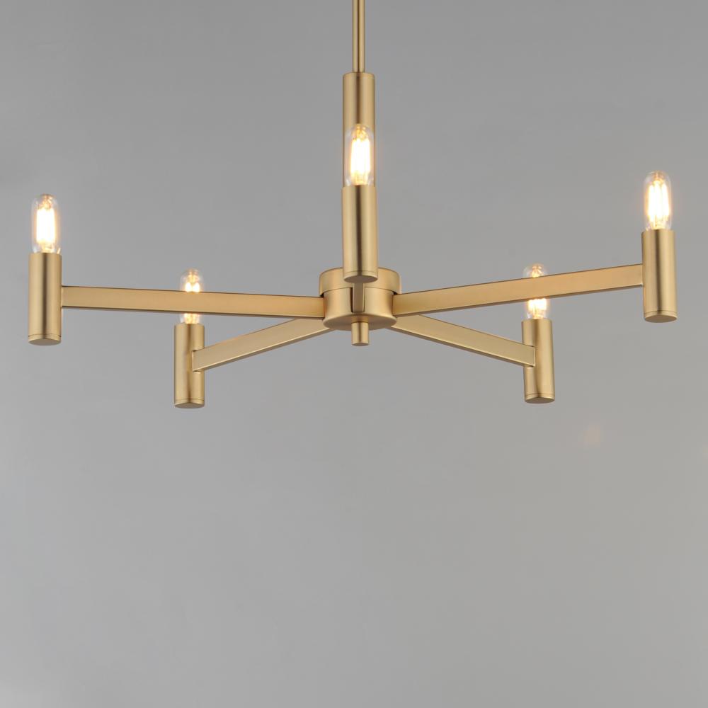 Straight extensions of rectilinear arms emanate from a cylindrical center housing in this transitional design. The candelabra is made in a corresponding cylindrical form playing into the geometries of this streamlined chandelier design. Available in a text