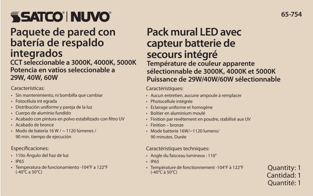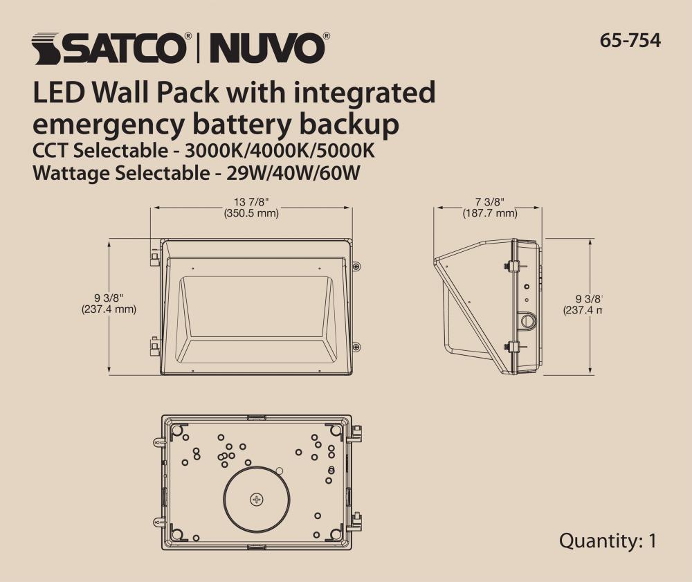 Introducing 65-754, SATCO NUVO's new CCT and Wattage selectable wall pack with integrated bypassable photocell and emergency battery backup. This cULus certified wall pack is offered in a traditional style with 29W/40W/60W wattage configurations, CCT s