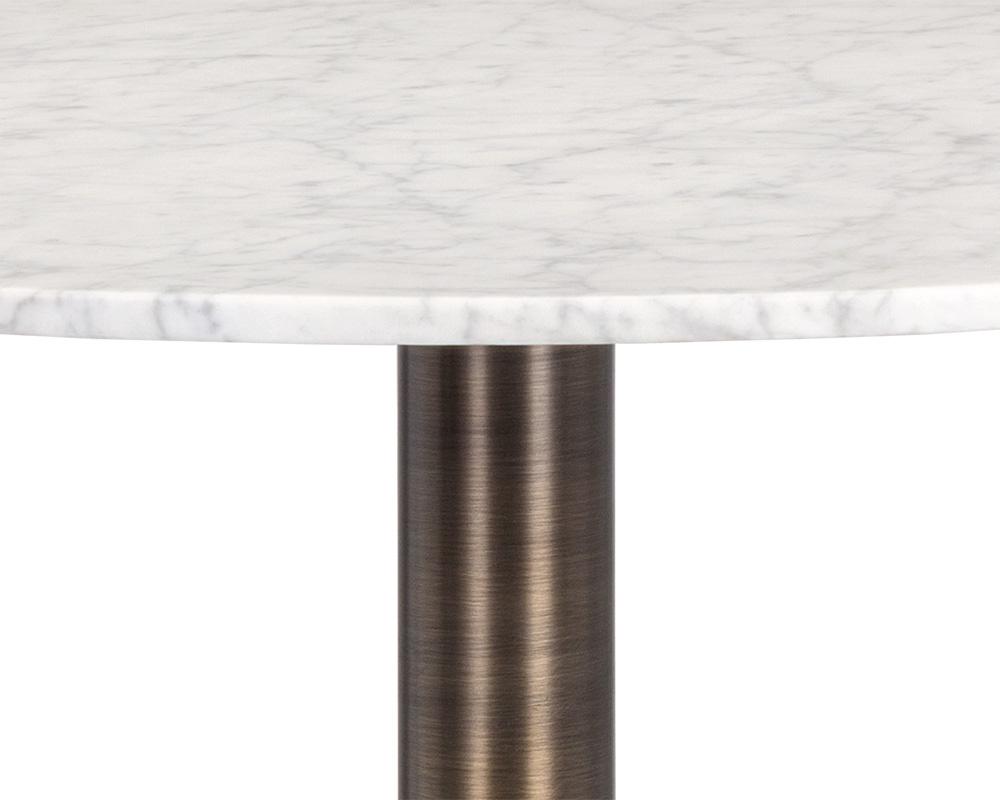 An Art Deco inspired round counter table, featuring a solid carrara marble top with an antique gold steel base. Perfect for bars, lounges and restaurants. As marble is a natural material, unique veining, pitting, fissures, micro-cracks and colour variations are all characteristics that add to the uniqueness and beauty of each piece.
