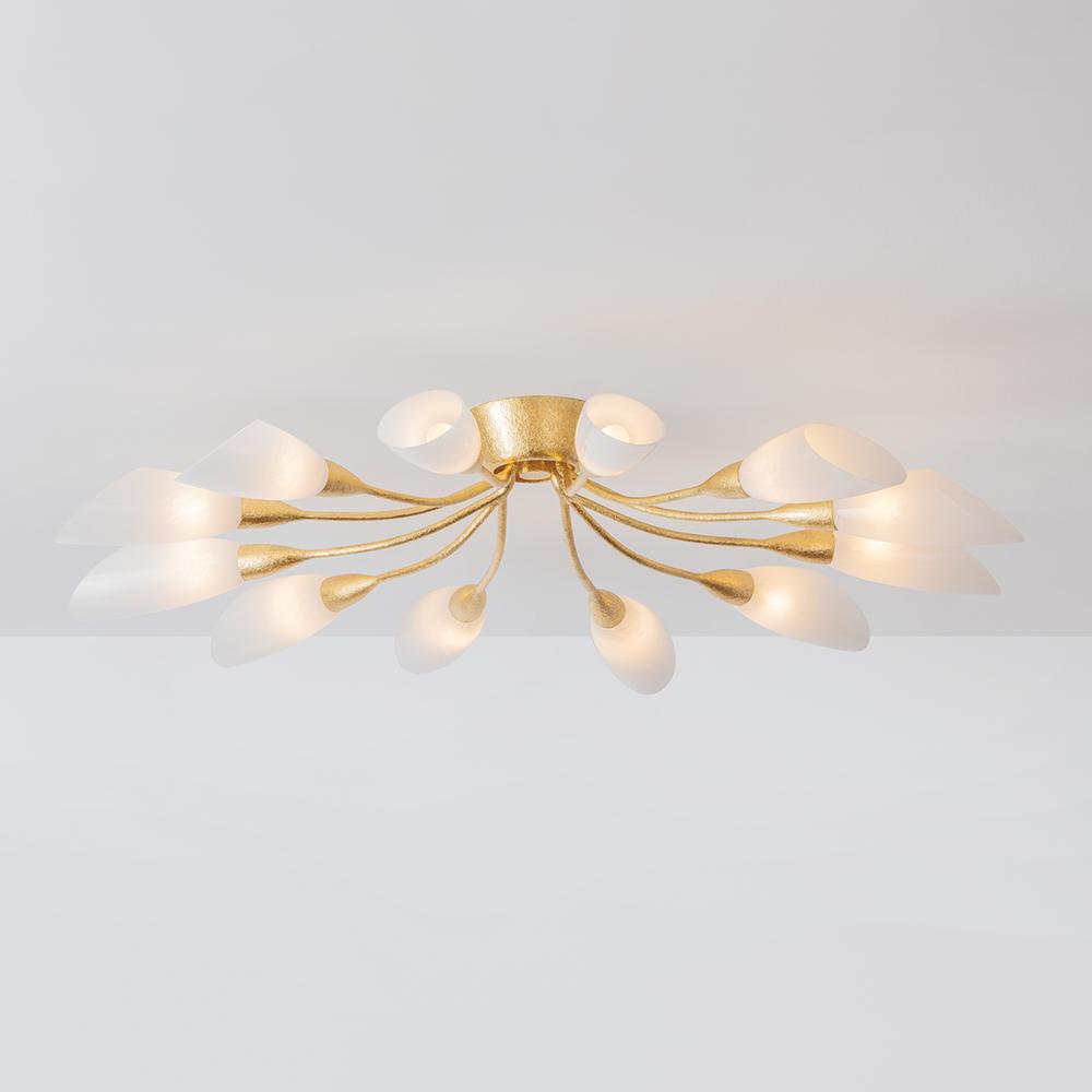 The botanical silhouette of Enfield features a sleek branching profile in scaled-up proportions. Cloud glass shades inspired by floral blooms offer a soft, contemporary feel with bias-cut ends that direct light upwards. The elongated, slender ‘stems’ embody a modern aesthetic, enhanced by the luxurious Vintage Gold Leaf finish.