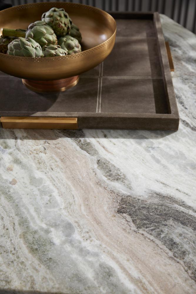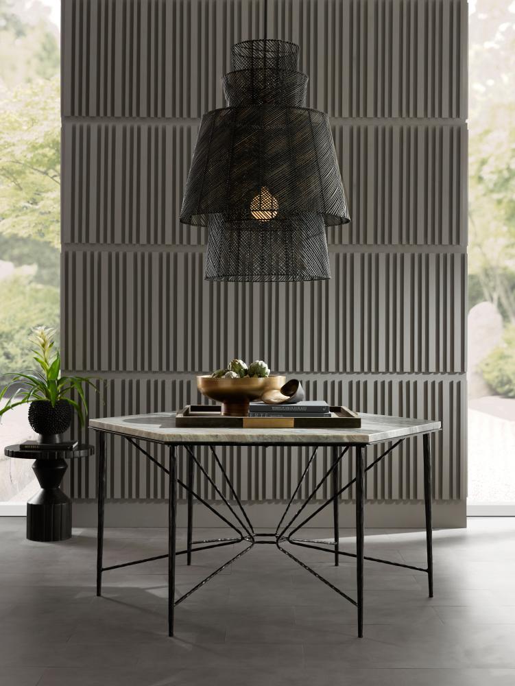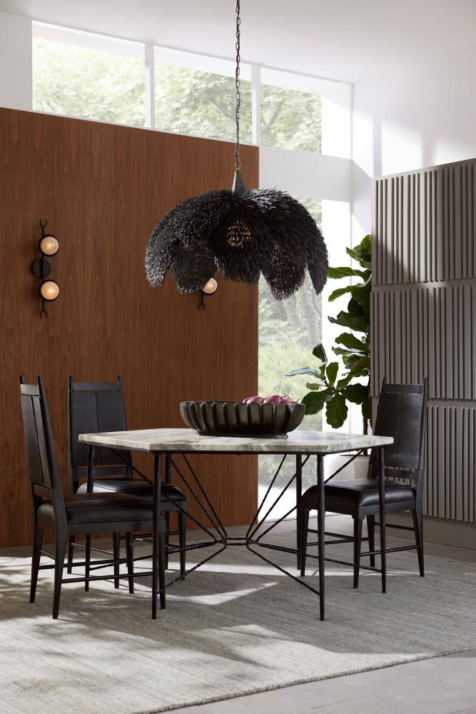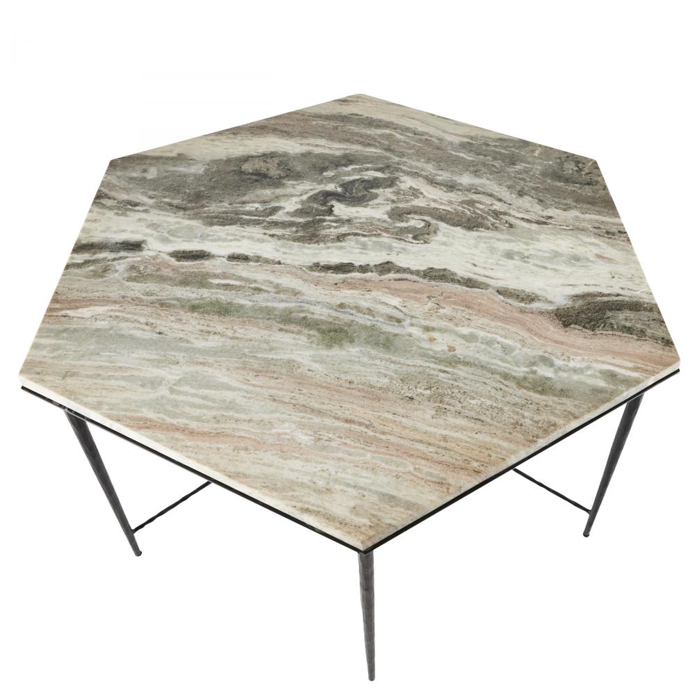 Reinventing the industrial aesthetic for a modern age, the Estrella adds a natural texture to any entryway or dining room. Both organic and contemporary, a heavily veined hexagonal top of toronto leathered marble pairs perfectly with a blackened iron frame. Poised on slim legs, it was designed to easily fit six chairs. Marble will vary.