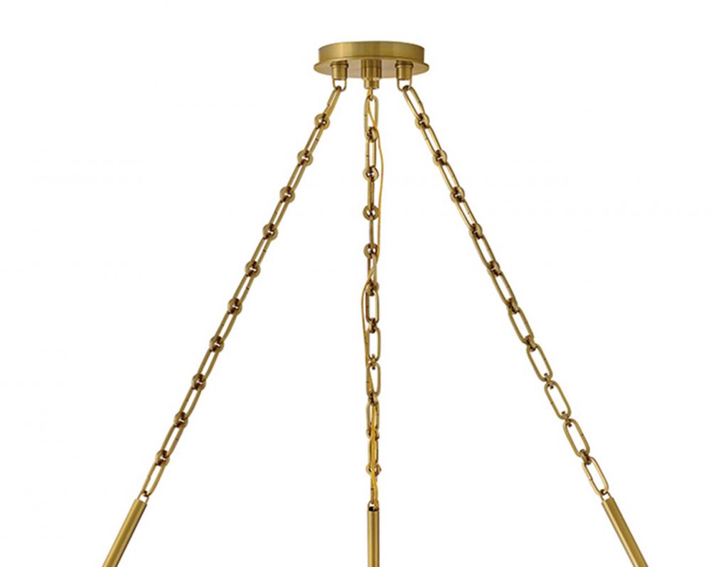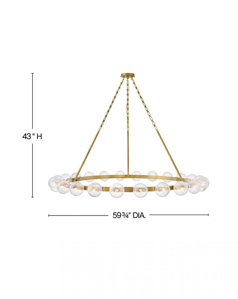 Dramatic crackled glass globes surround Coco’s timeless silhouette with unexpected, distressed detailing. Minimal framing suspended from decorative stem-to-chain uprights features a warm and inviting Lacquered Brass finish.