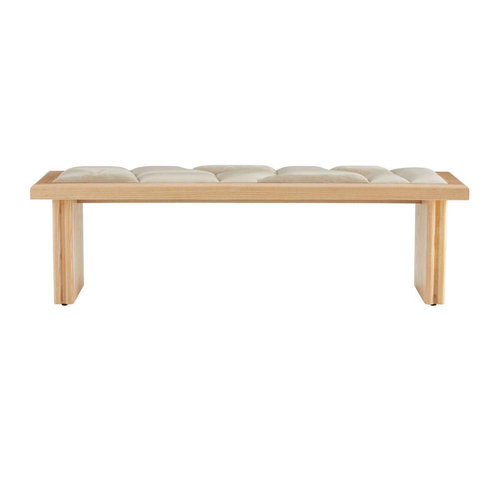 Tone-on-tone greige leather and taupe suede add textural allure to a waterfall blonde ash wood frame. Built at a more extended scale for larger living areas, the base's bullnose edges complement the geometric patterns of its eye-catching seat. Each puzzle-like piece is upholstered separately. Leather and suede will vary.