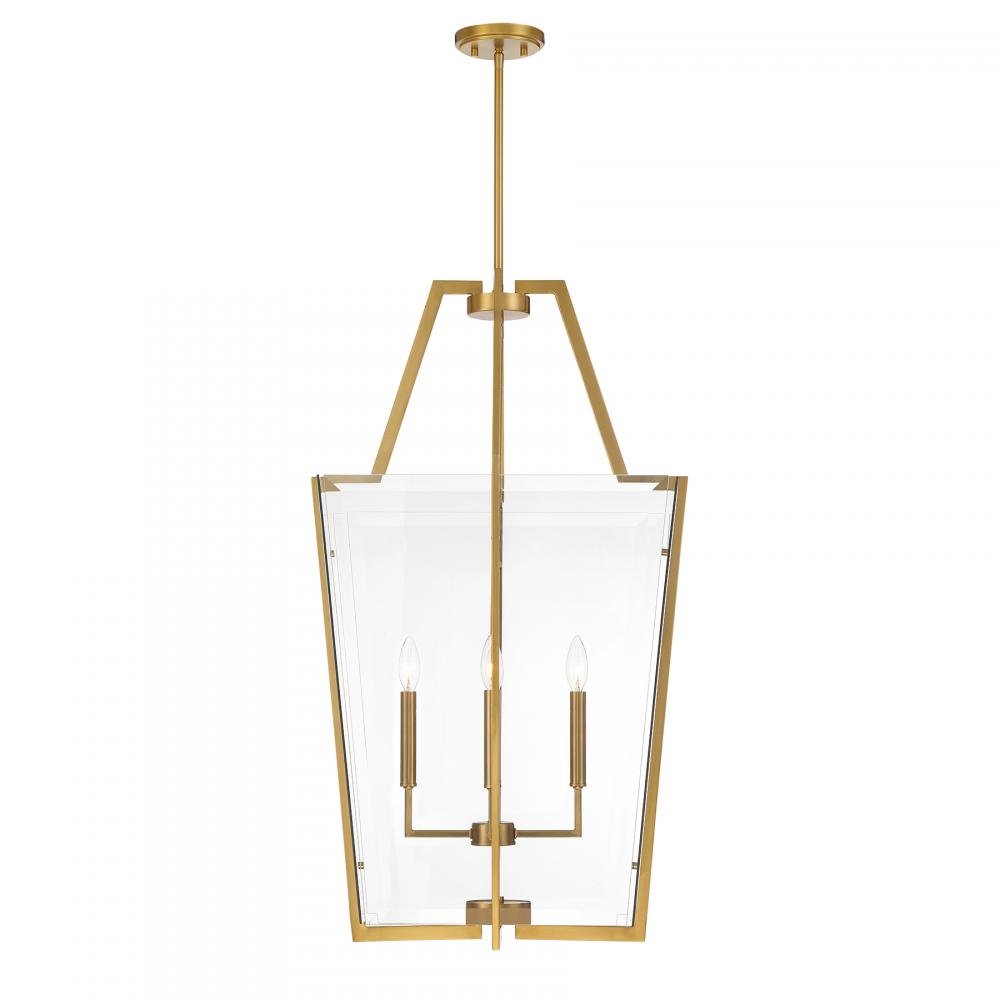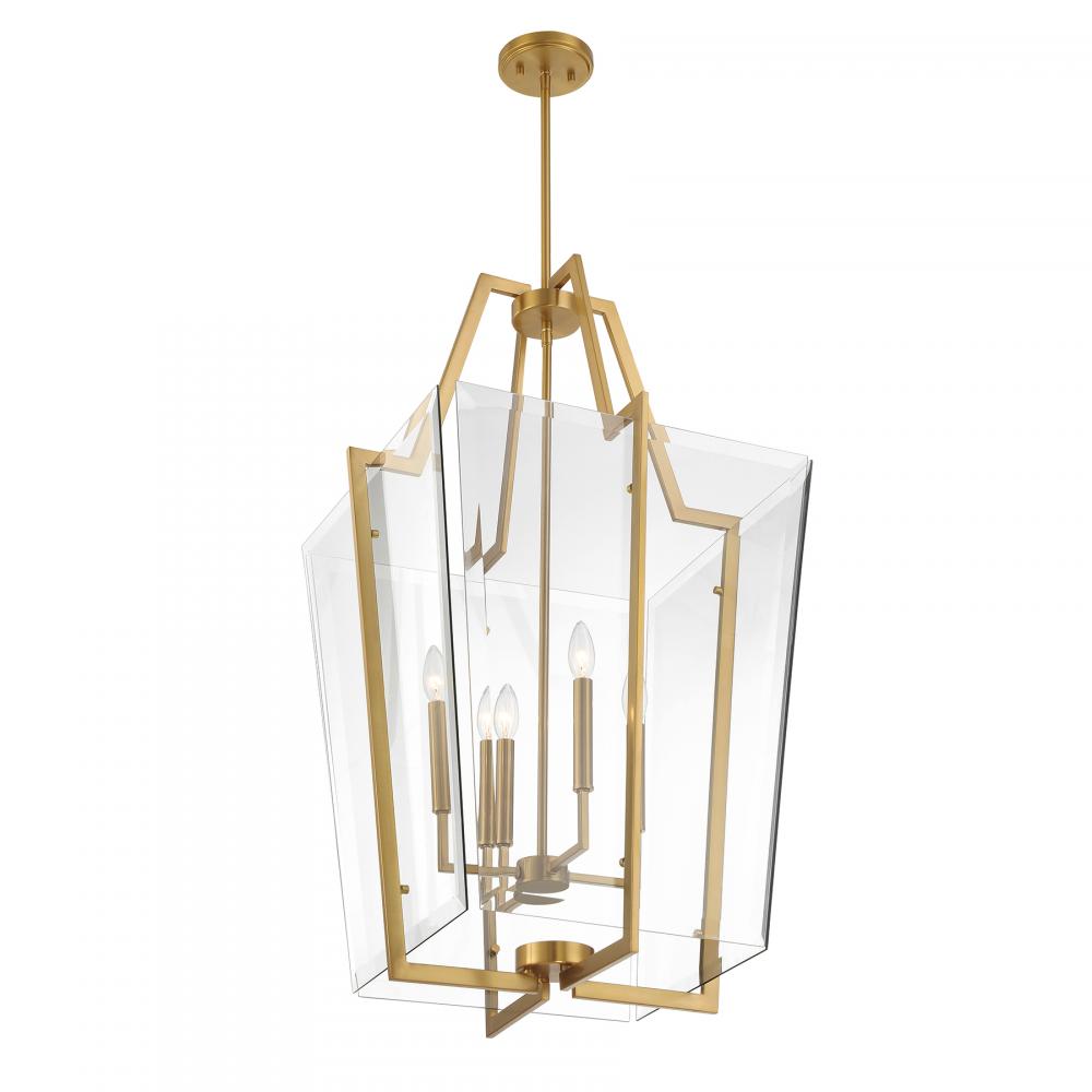 Create an effortlessly fashionable look with the Savoy House Farell 4-light pendant. Whether in a foyer, over a kitchen island or setting the tone in a room, the gorgeous geometry and clear beveled glass shades will look terrific. Warm Brass finish. Farell is 21" in width and has an adjustable height ranging from 36" to 90". Comes with four 12" downrods and one 6" downrod. Uses four candelabra size bulbs of up to 60 watts per bulb. Bulbs not included.