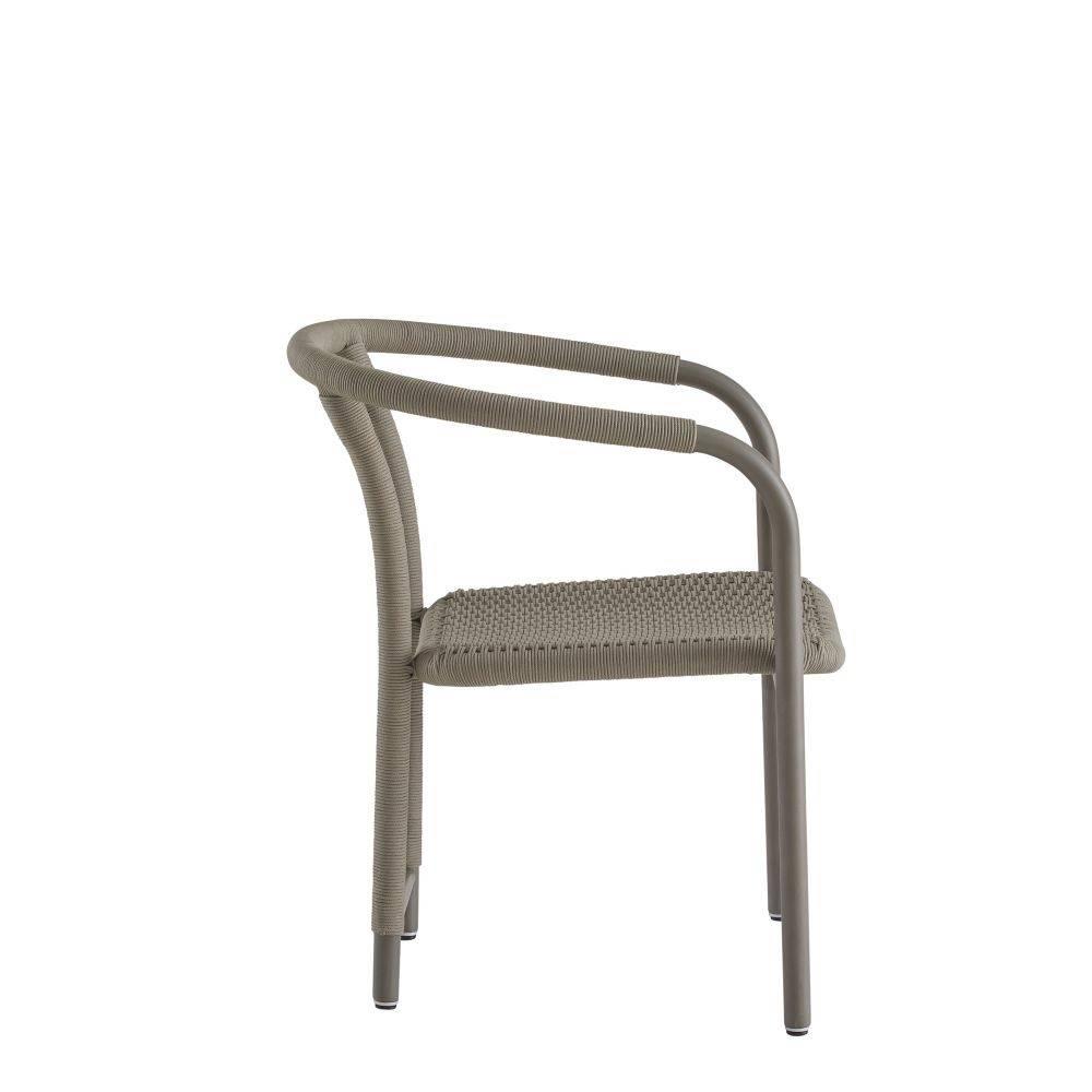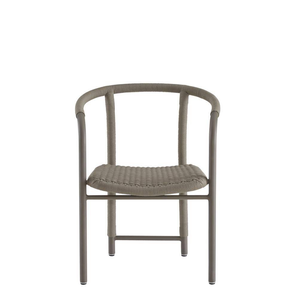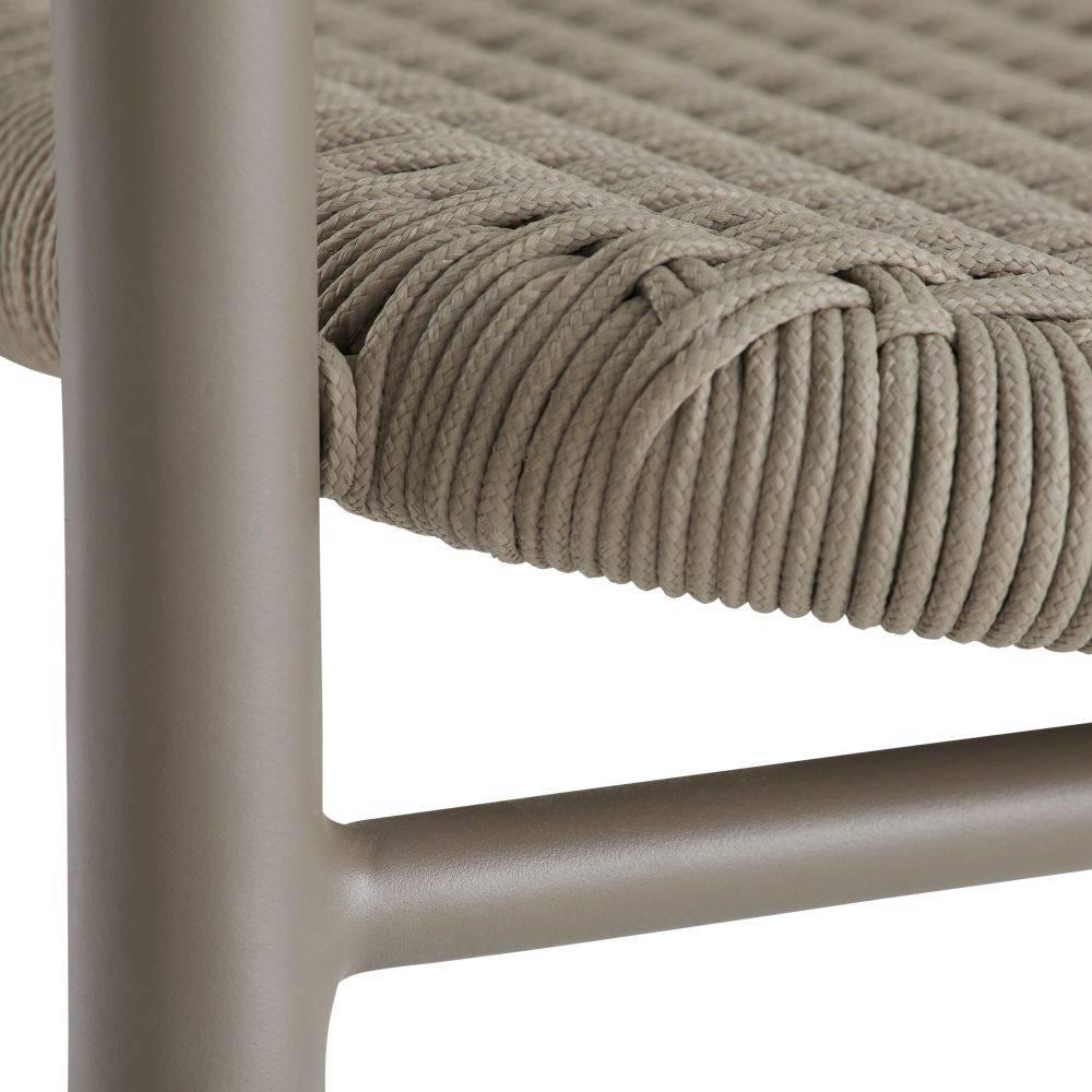 Wrapped woven details elevate the simple, bistro-style body of the Feller. The graphic nature of its aluminum form is highlighted with a tone-on-tone gray powder coat. Finished with a sturdy fossil synthetic rope seat, this contemporary chair moves effortlessly from seating area to outdoor dining table.