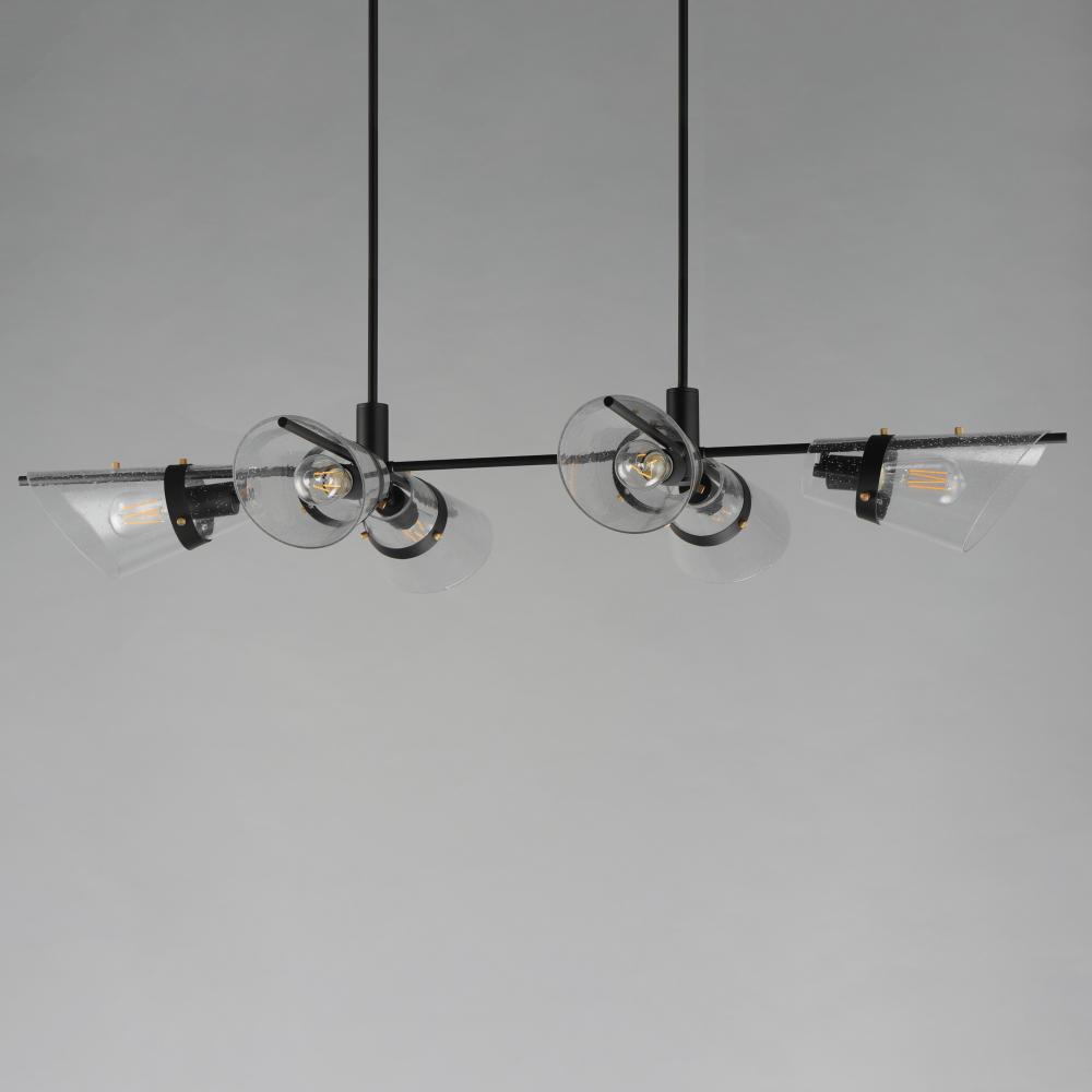 Architectural and effortlessly striking, the Finch collection reimagines classic forms through a modern lens. Tapered cones of clear seedy glass are precision-cut on a diagonal slant, creating dynamic lines that shift with perspective. The Dark Bronze fram