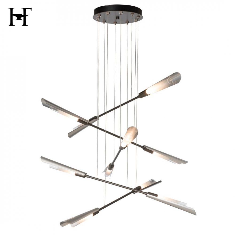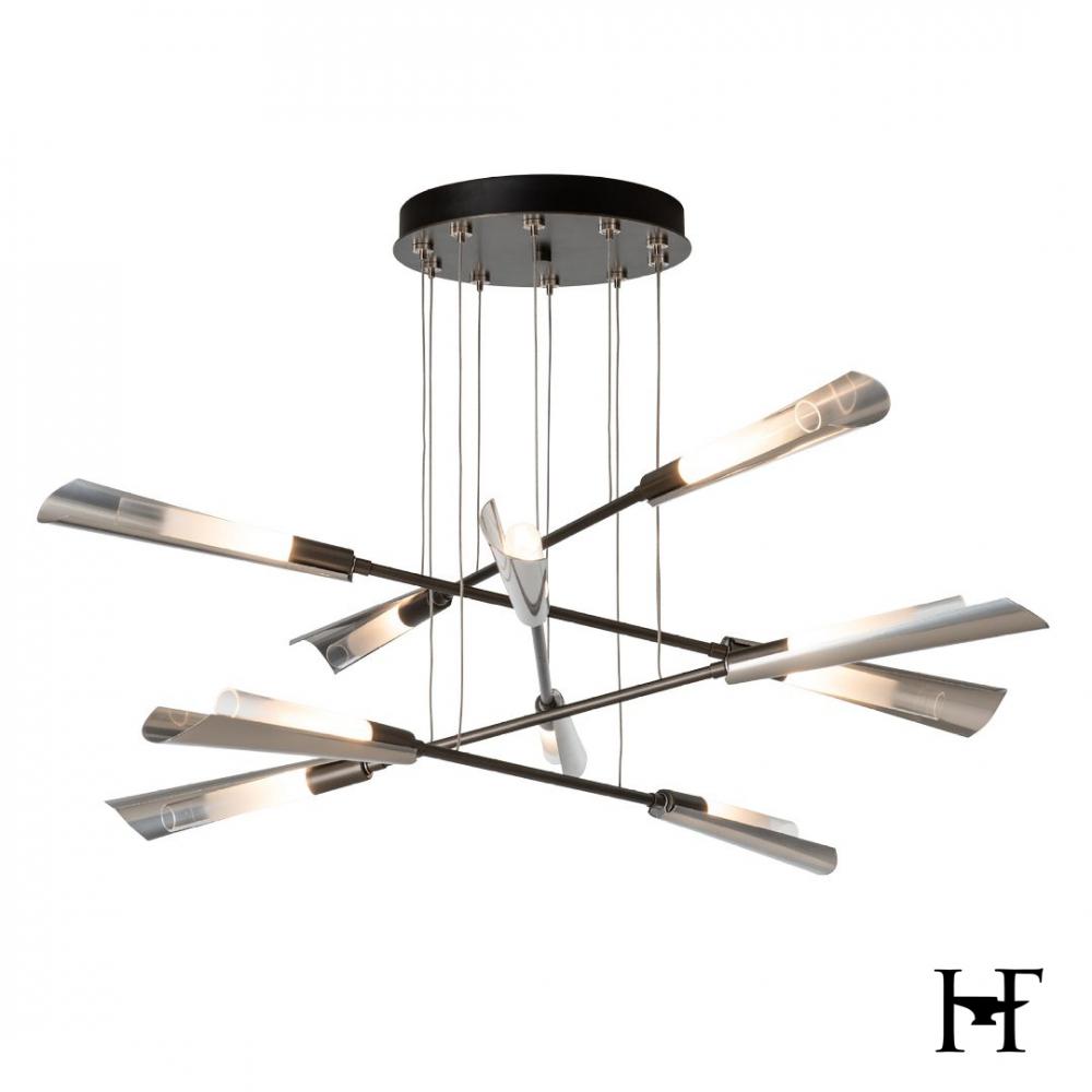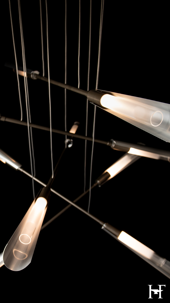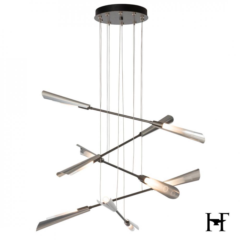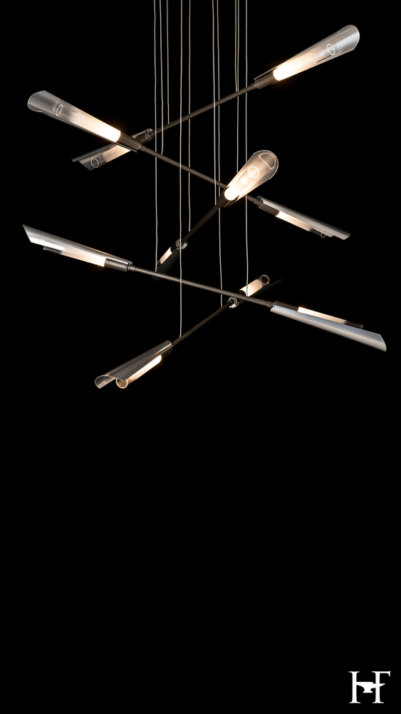 Reminiscent of a kettle of hawks soaring thermals, the Flight 10-Light Small Pendant looks stunning as a cascading pendant in a stairwell or entry; or positioned close to ceiling in dynamic effect, thanks to its highly-adjustable design. Ombre borosilicate glass tube diffusers enclose the bulbs while adjustable curved metal reflectors direct and shield each light.