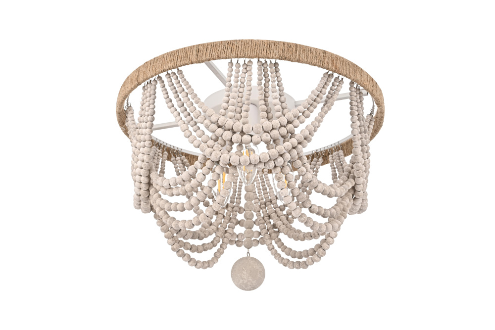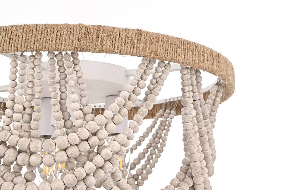 Distinctive rope-wrapped crown creates a rustic-luxe frame for cascading wooden beads.
