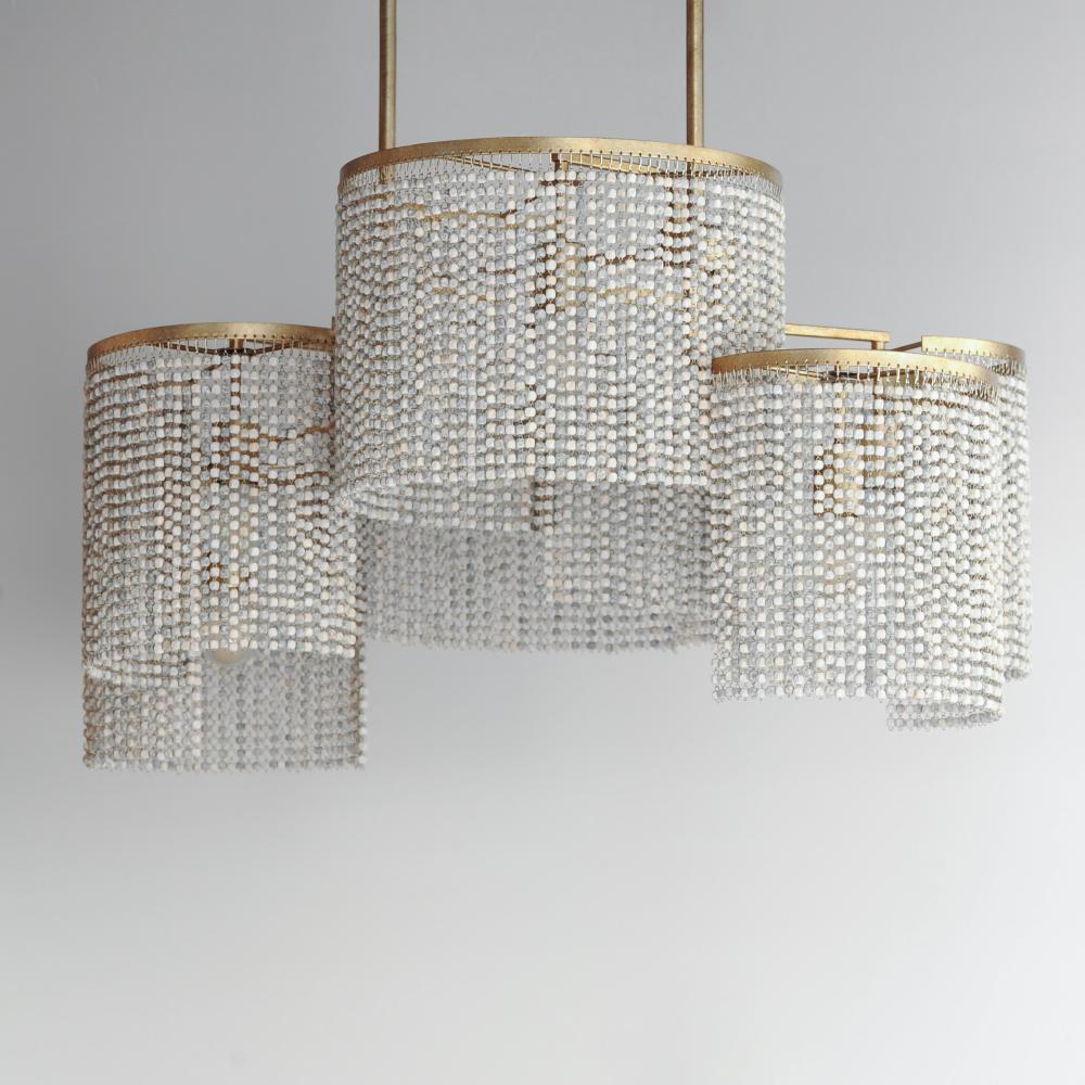 Cascading strands of square Weathered Wood beads are suspended on an offset spiraling frame finished in hand-applied Golden Silver leaf. The craftsmanship of the design is complimented by the soft glow of light within adding ambience to any space. Availabl